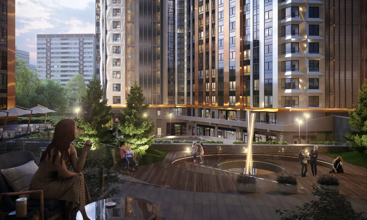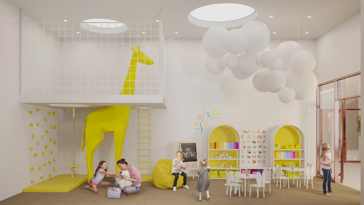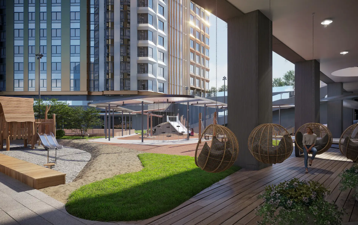 Внутренний двор представляет собой двухуровневое пространство с игровыми площадками для детей разного возраста на нижнем уровне, и местами для занятий спортом, йогой и деревянными террасами на верхнем уровне.