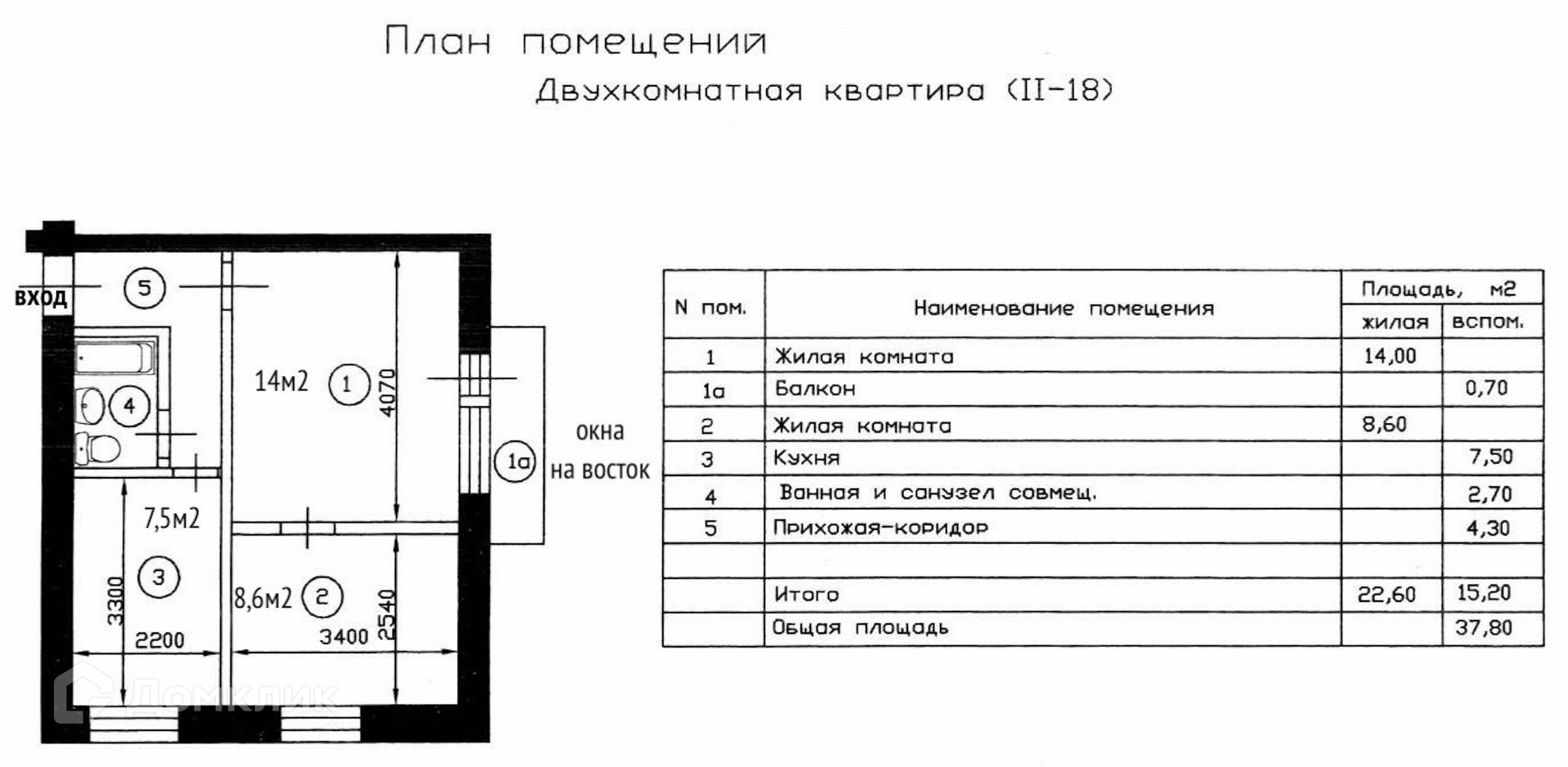 План: общая площадь 37 м², с балконом (выход из гостиной) 37,8 м², гостиная 14 м², спальня 8,6 м², кухня 7,5 м², совмещенный санузел. Установлены пластиковые стеклопакеты, окна выходят на восток.