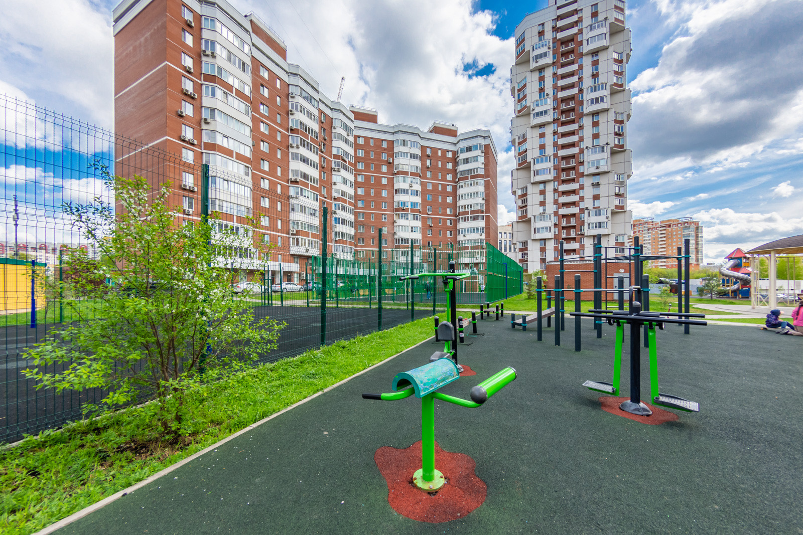 разнообразные спортивные и детские площадки, в доме подземный паркинг, так же бесплатная парковка вокруг дома (всегда найдете место).