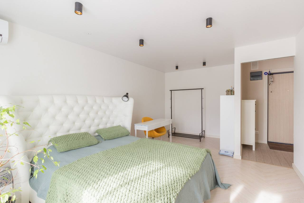Комната: Спальное место -- кровать от Асконы, над кроватью штендер для проектора -- проекция на стену (стены - обои под покраску), рабочее место, место для хранения личных вещей, блекаут шторы для здорового сна.