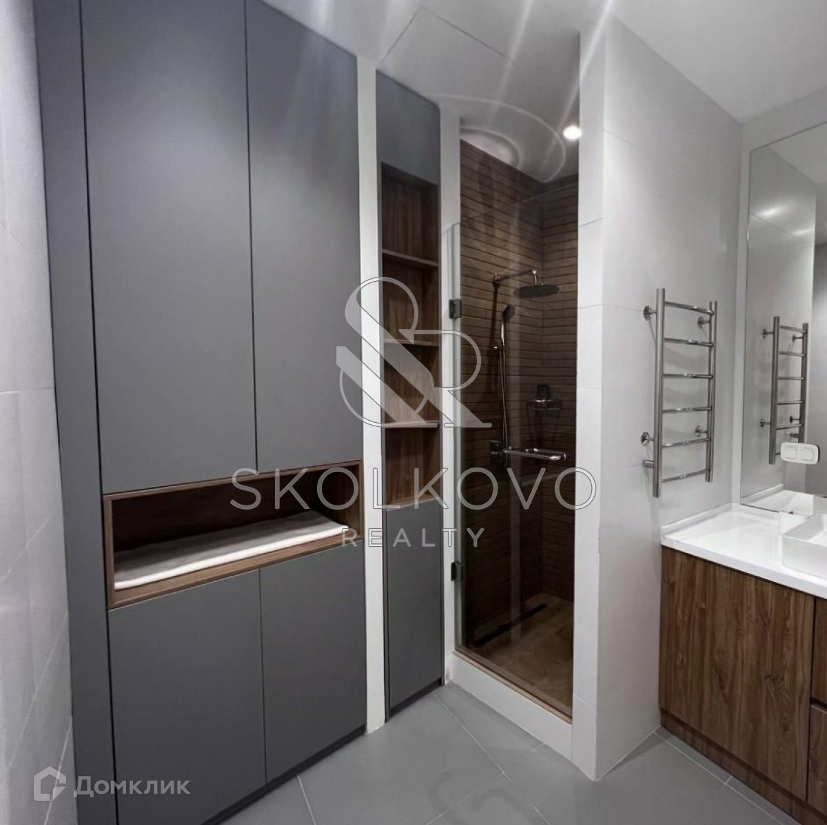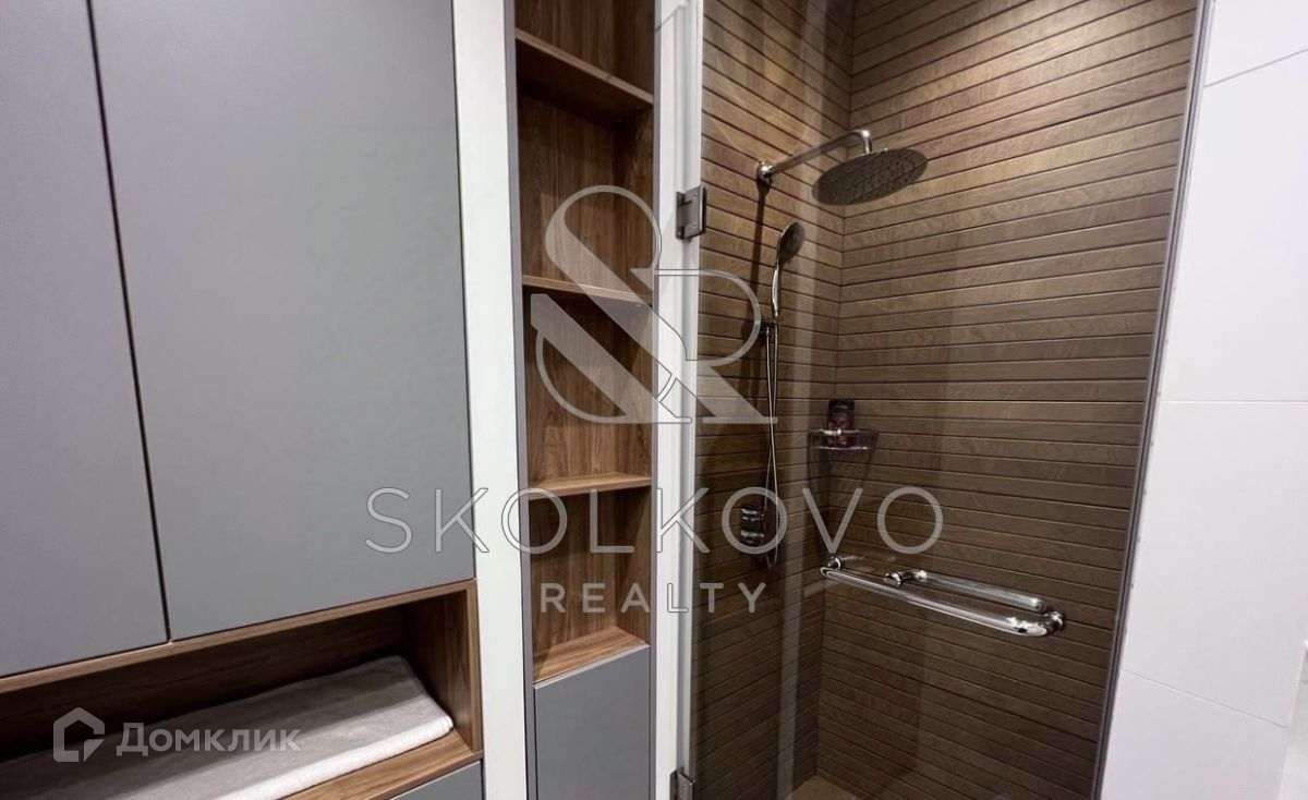 Просторный санузел. Много мест хранения, которые грамотно спрятаны.Шторы с электроприводом.