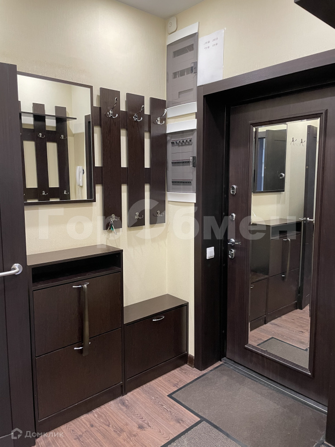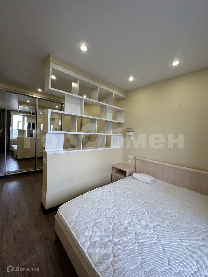 Есть шкаф-купе во всю стену, хозяйственный шкаф, стеллажи и балкон.