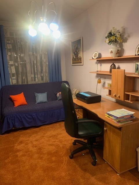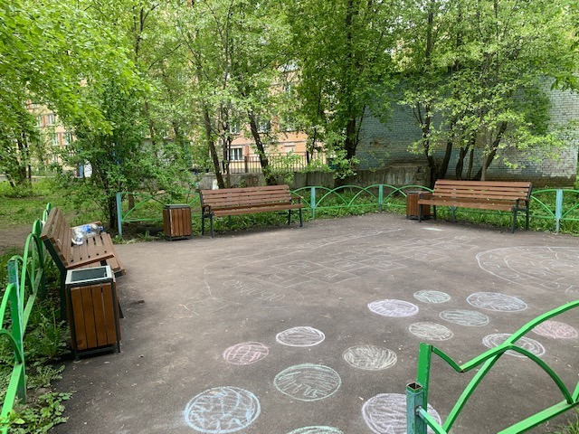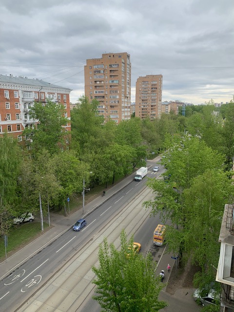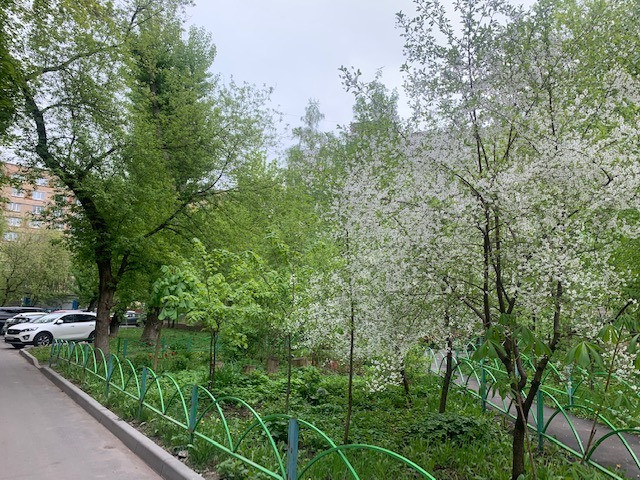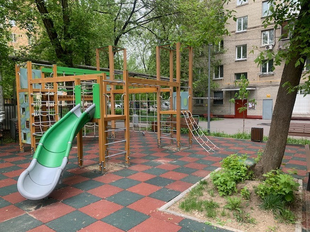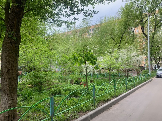 Три окна выходят на юго-запад, в зеленый тихий солнечный двор с детской площадкой.