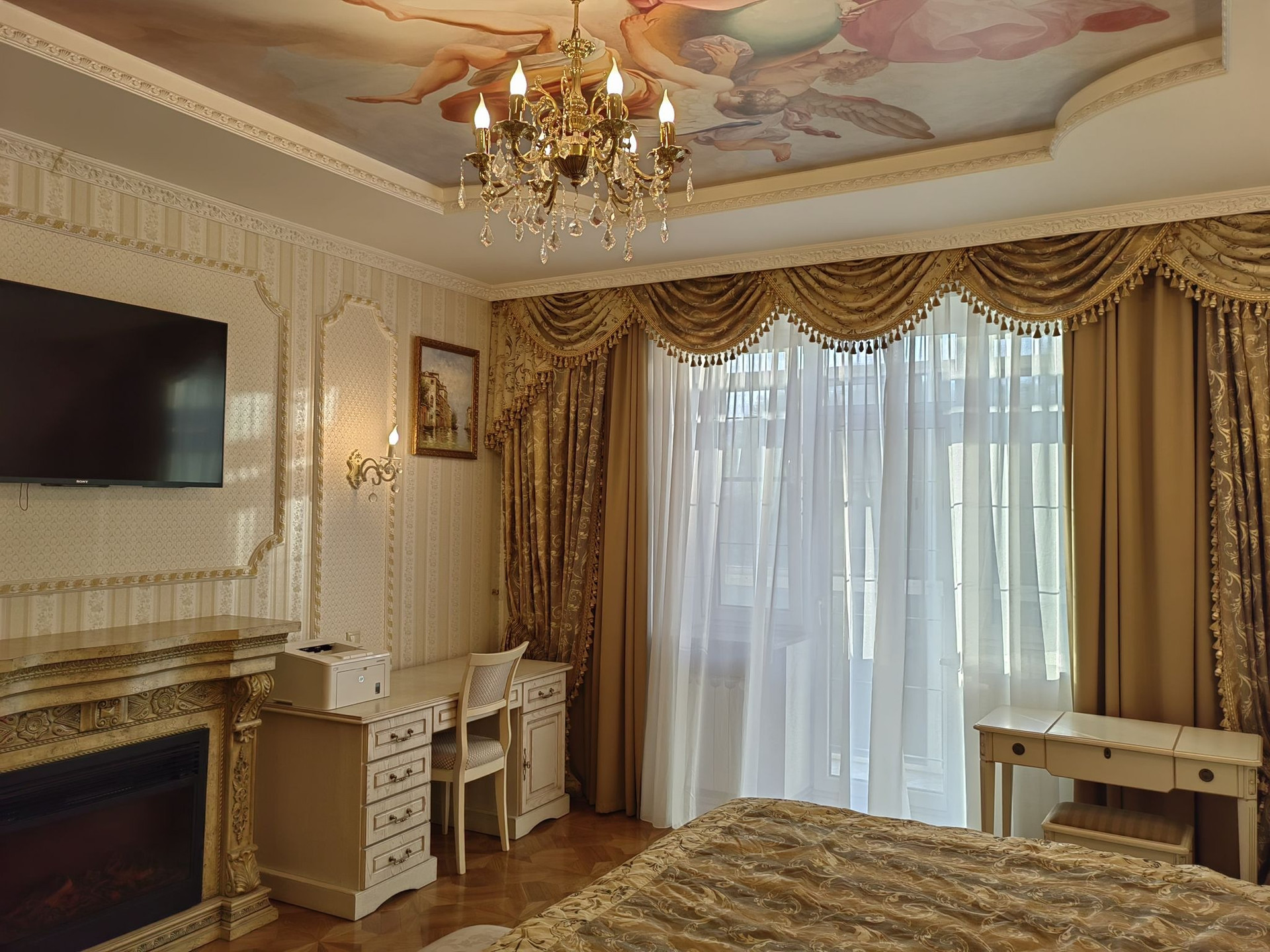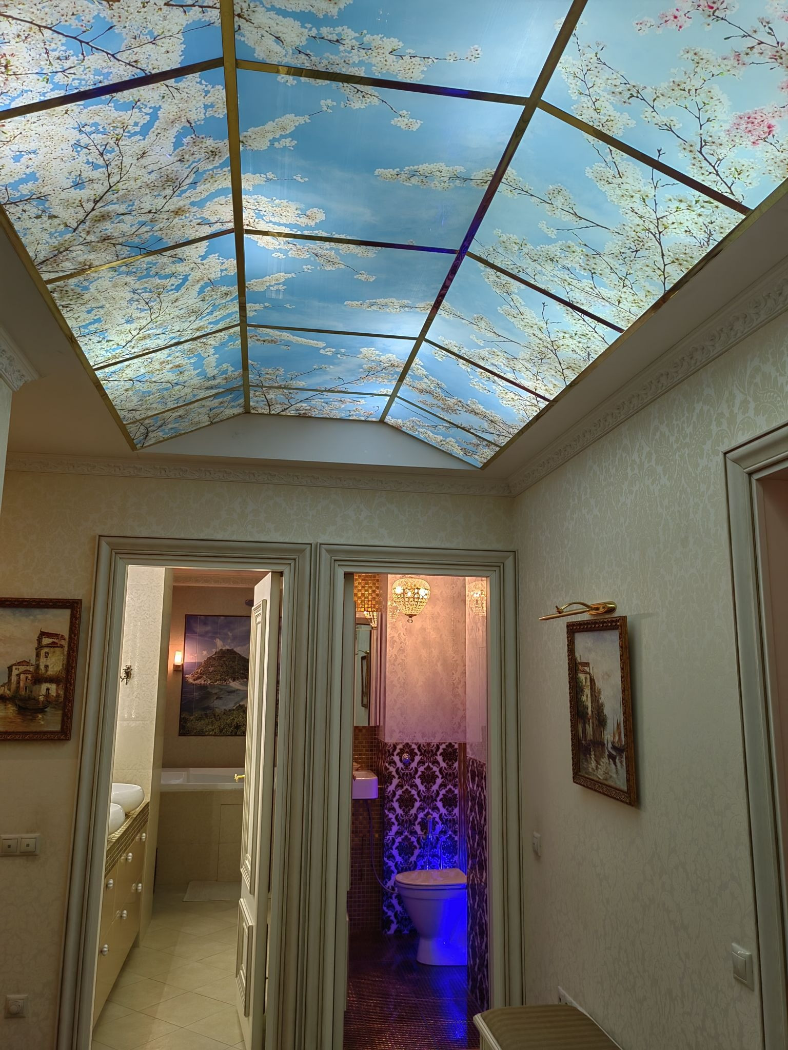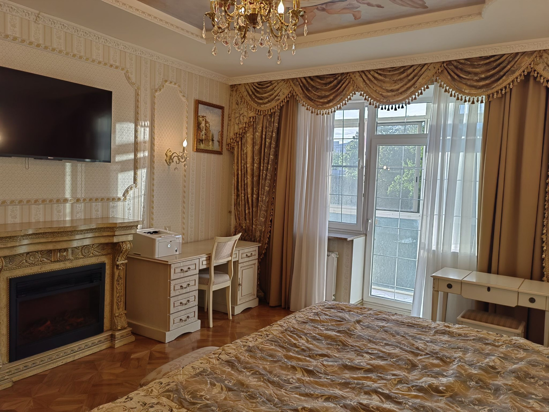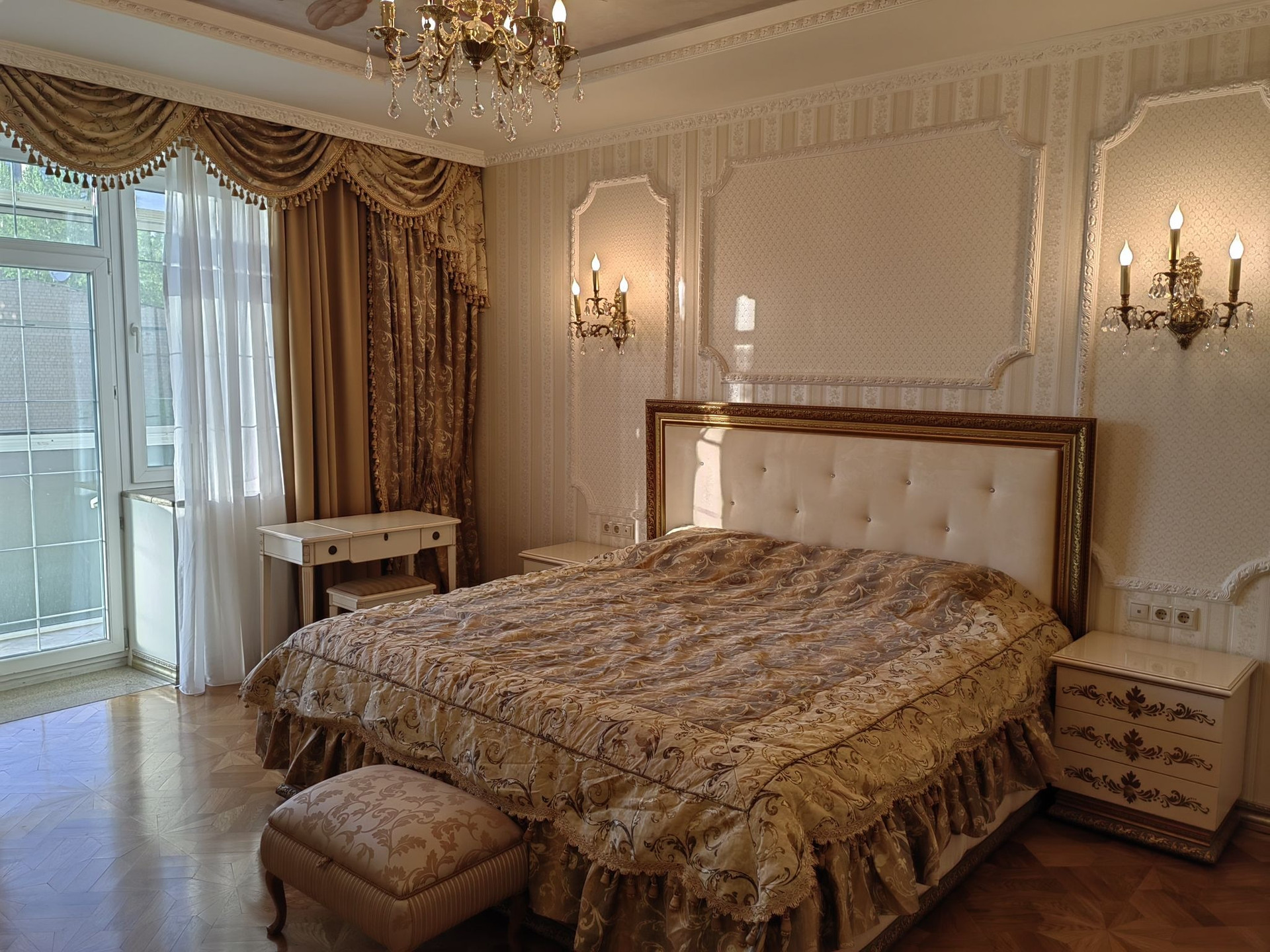Жилые комнаты 20, 20 и 24 м.кв. Навесной потолок сподсветкой и росписью. Из спальни выходит застекленная лоджия.