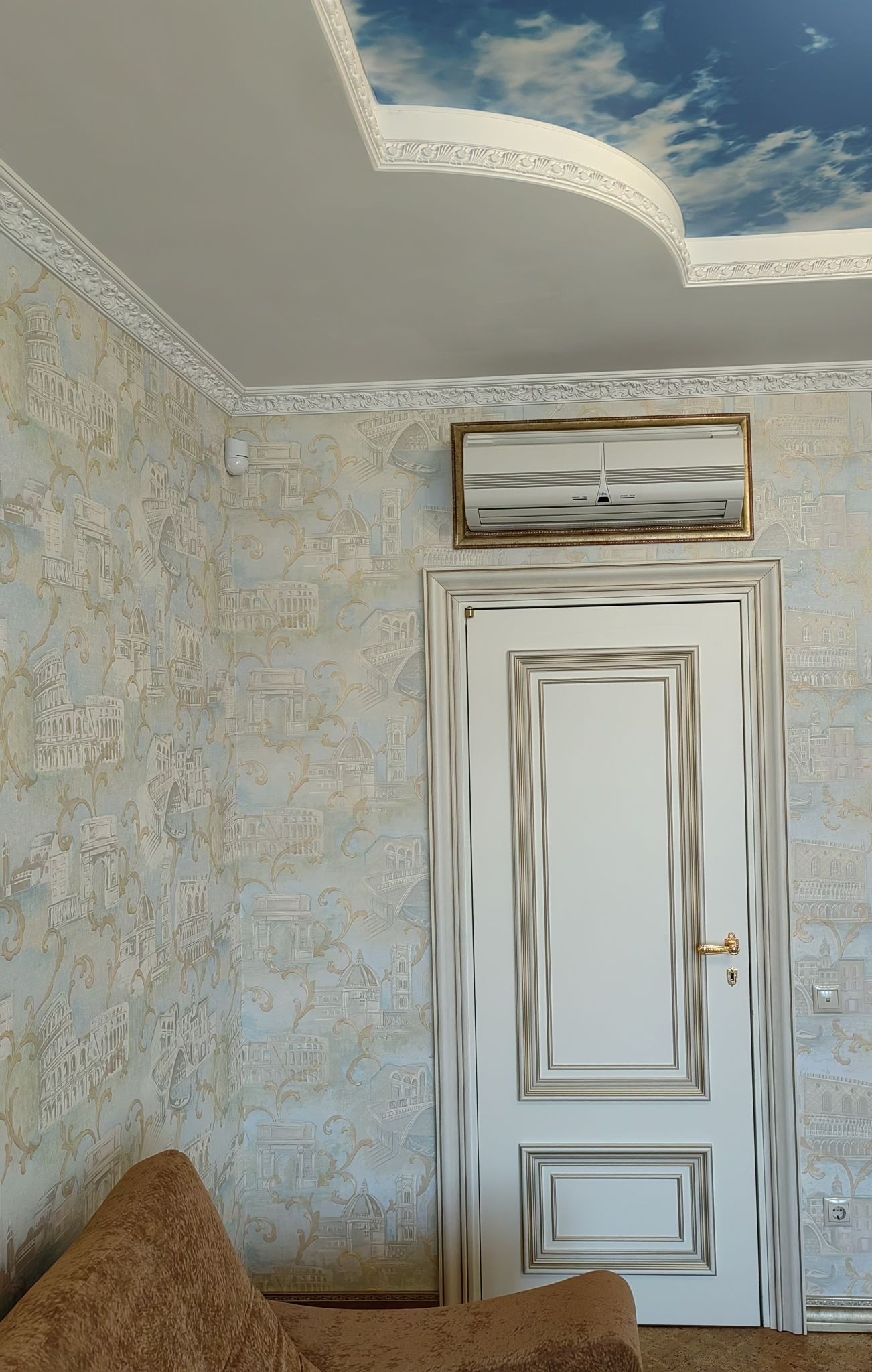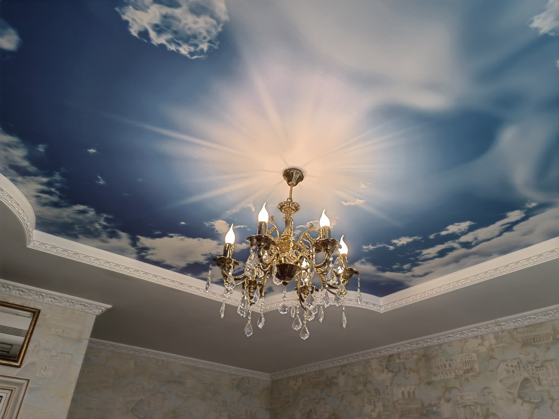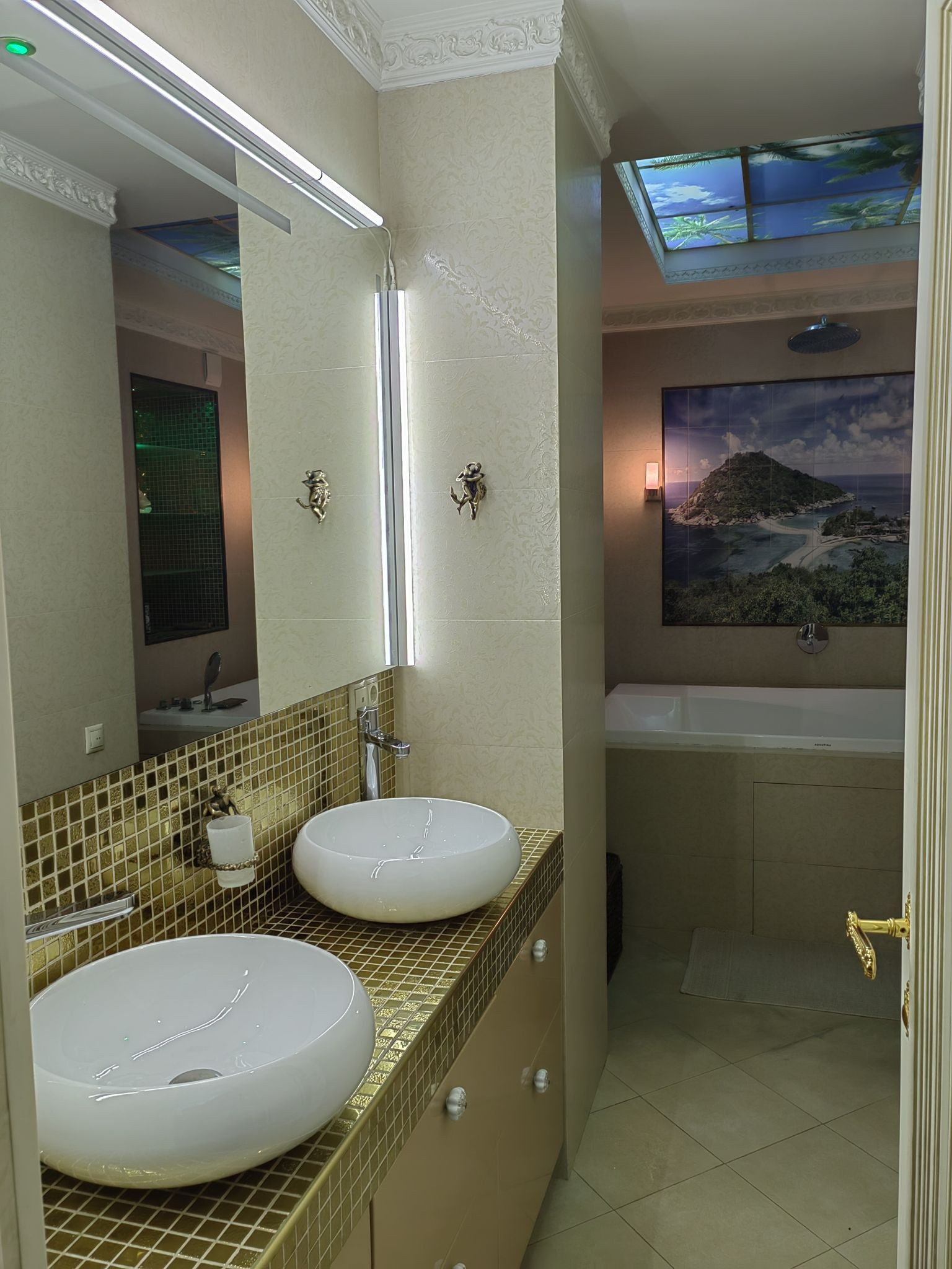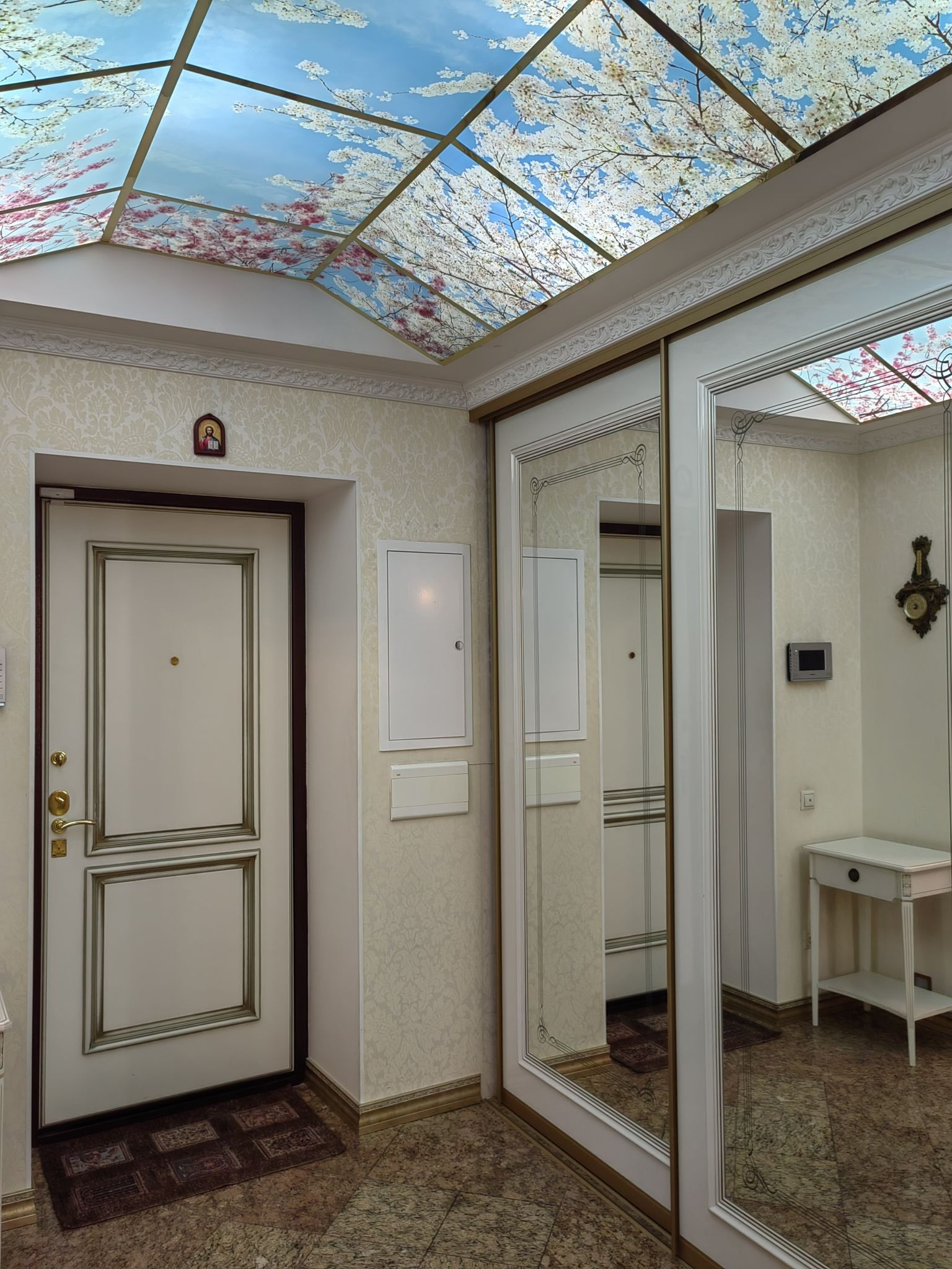 Жилые комнаты 20, 20 и 24 м.кв. Навесной потолок сподсветкой и росписью. Из спальни выходит застекленная лоджия.