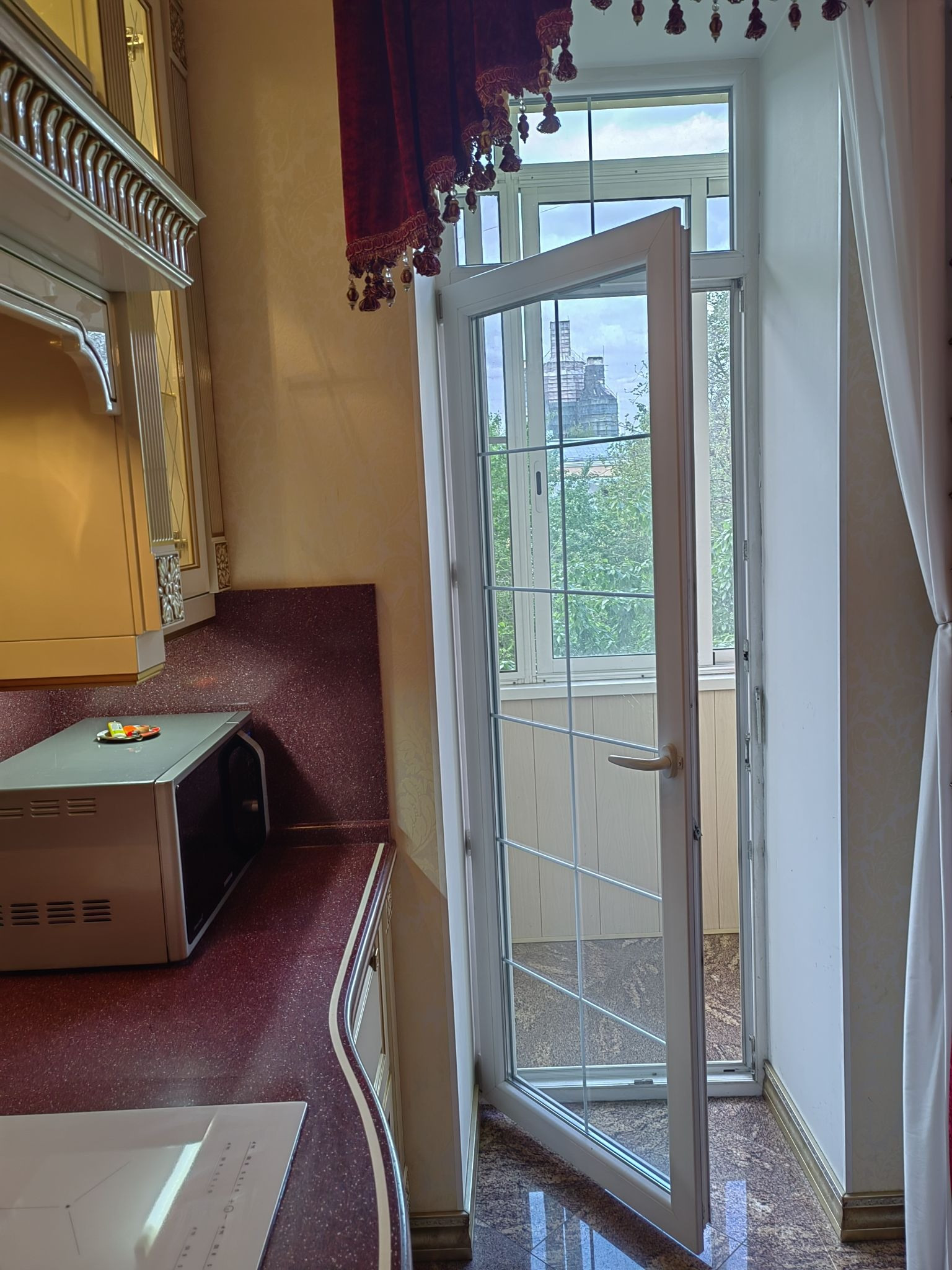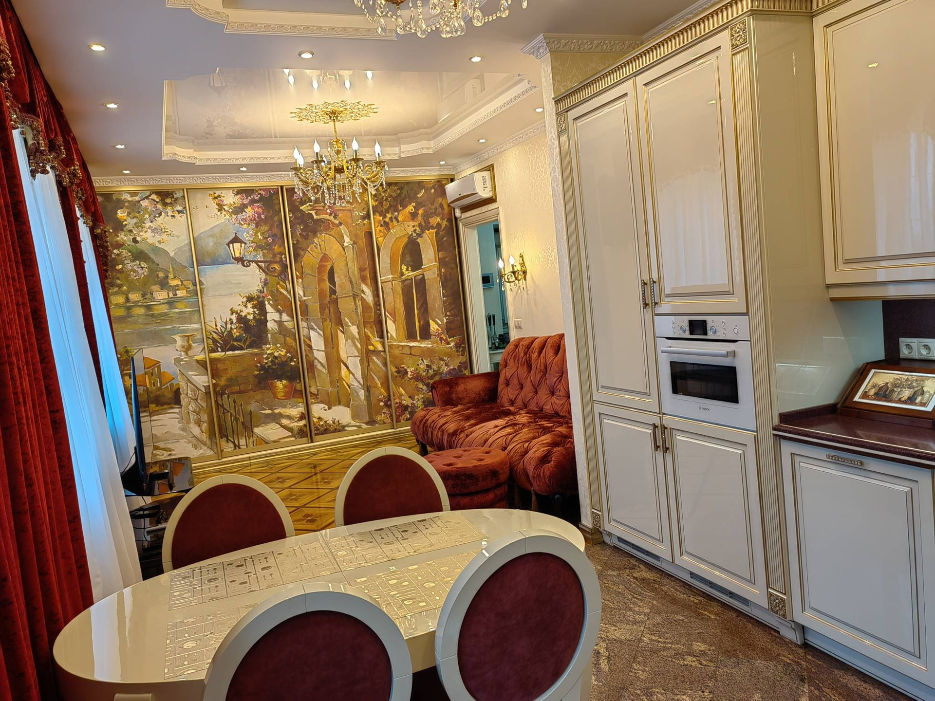 Кухня-столовая с новейщей техникой: индукционной плитой Electrolux, встроенным холодильником, духовным шкафом и посудомоечной машиной - фирмы Bosch. На кухне - застекленная лоджия. Имеется большой встроенный шкаф. Полы: гранит и паркет из дуба. Подоконники- гранит.