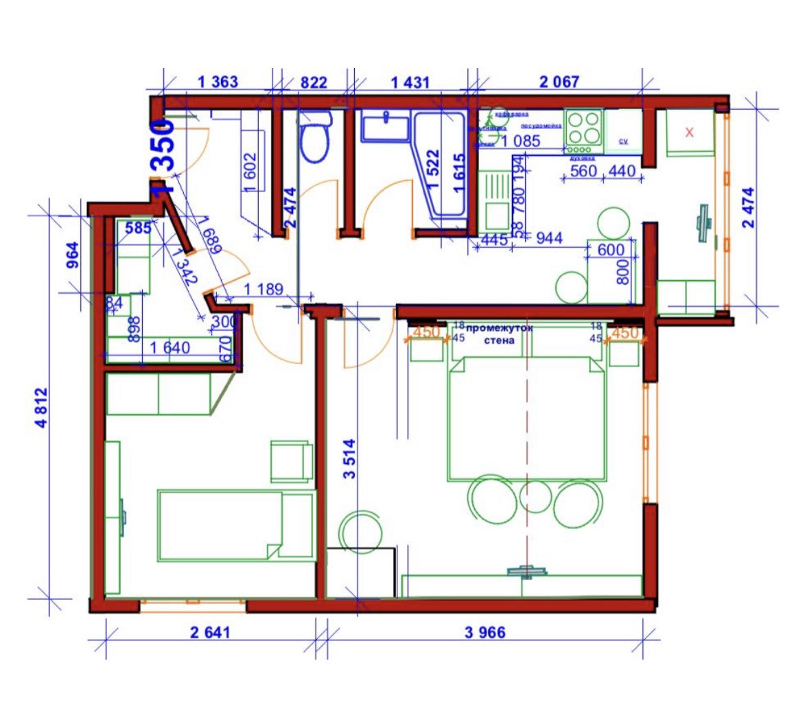 Очень продуманная планировка, гостиная-спальня и детская комната, раздельный с/у, гардеробная.