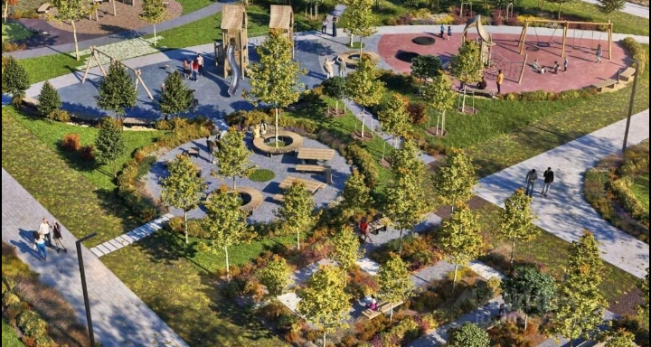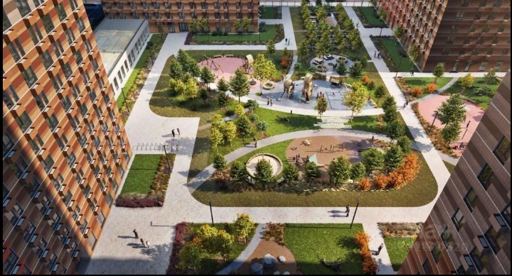 В жилом квартале благоустроенная территория с дворовыми парками, собственные детский сад и школа. Для тех, кто любит активный отдых, футбольные и баскетбольные площадки.