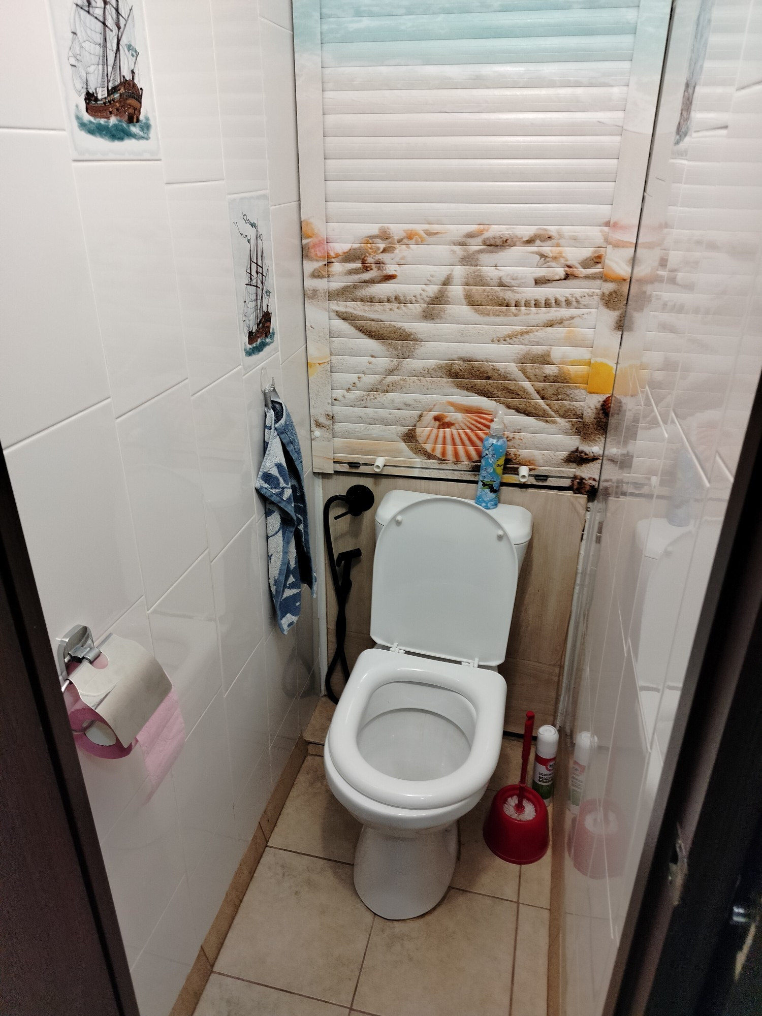 В туалете рольставни, счётчики воды, гигиенический душ, держатель для бумаги, светильник, кафель.