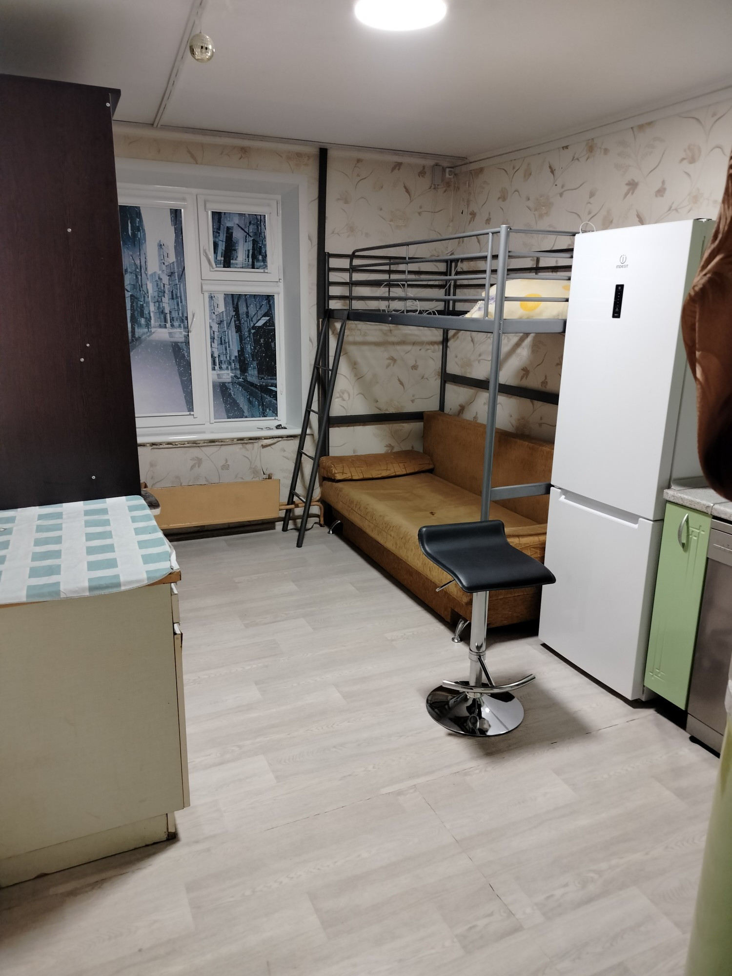 В студии новый стеклопакет с подоконником, с москитными сетками и роль шторами с фотопечатью. Свет верхний два варианта- тёплый и холодный. Поверх окна по всей стене светодиодная лента цветная на пульте управления. Проводной интернет. на полу ламинат, застеленный сверху линолеумом. Заказана решётка на окно "Лоза".Обои чистые, потолок тоже. Всякое техника в рабочем состоянии входит в стоимость.