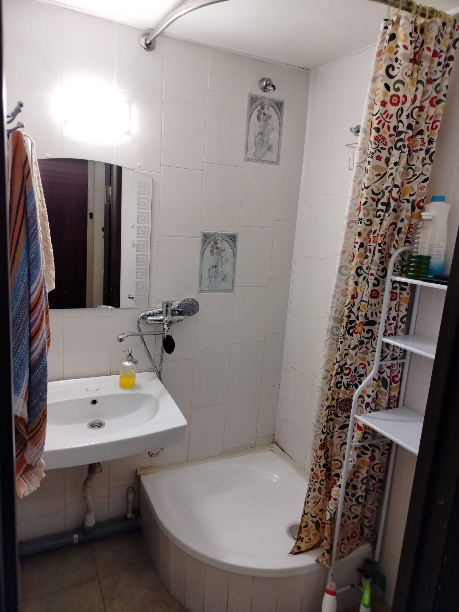 В душевой можно оборудовать ванну. Есть вешалки, держатели для принадлежностей, полка напольная и выводы для второй стиральной машины, розетки.