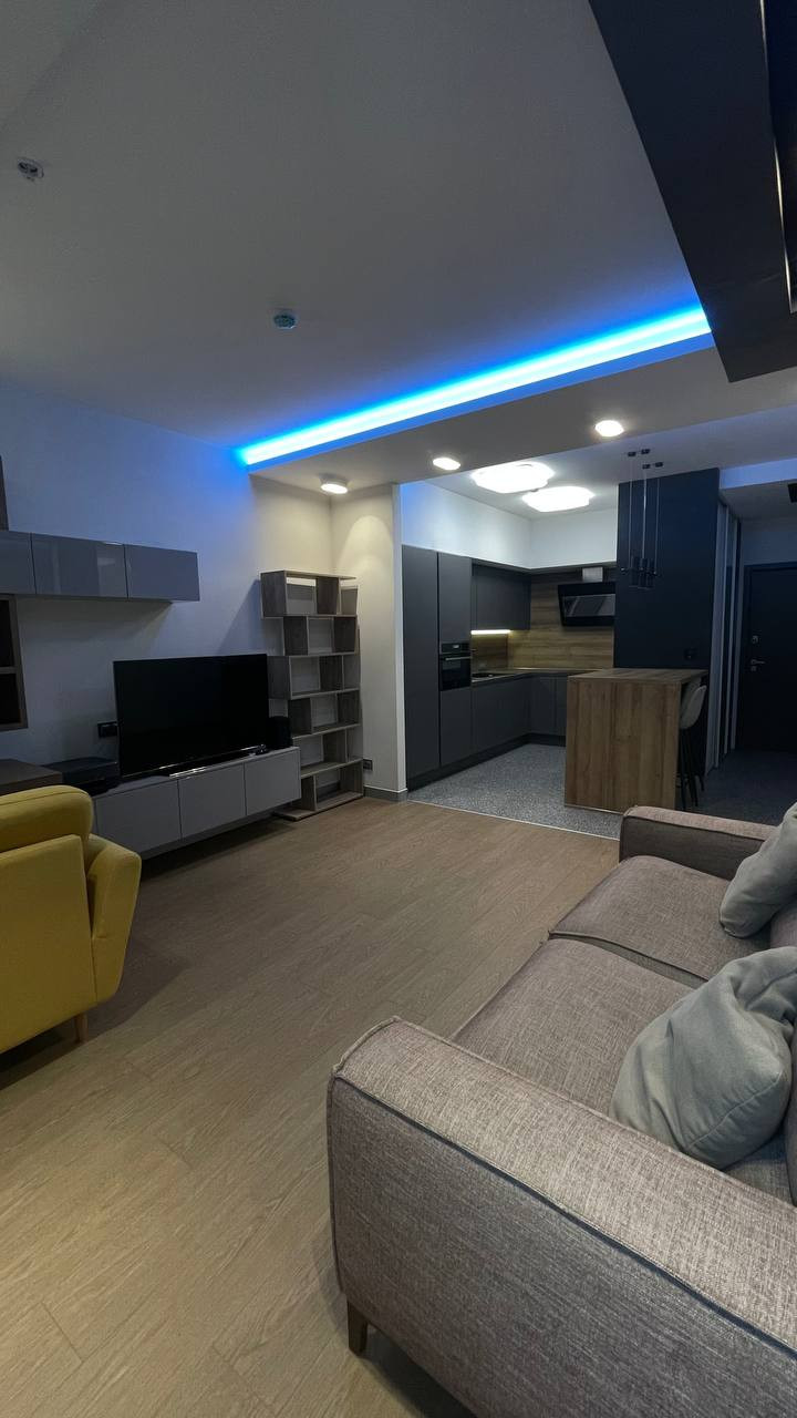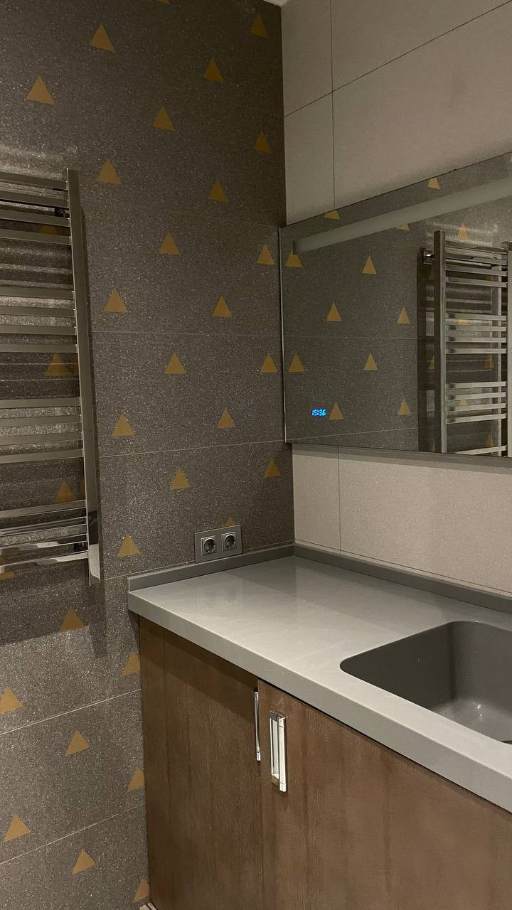 Удобная планировка: кухня пр-во Италия со встроенной европейской техникой (холодильник, индукционная плита, объединенный духовой шкаф/микроволновка, посудомоечная машина). Спальная комната с двуспальной кроватью 220/200 см и вместительная гардеробная, которая дополняется объемным шкафом с остеклением в прихожей. Большой совмещенный санузел с душевой кабиной и стиральной машиной. Светодиодная подсветка по всему периметру квартиры. Подогрев полов на кухне и в ванне, кондиционер.