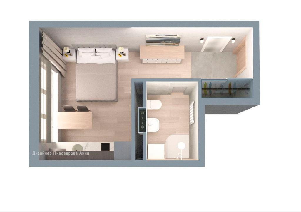 Квартира располагается в корпусе 1 на 3 этаже.  Квартира сдается без отделки.  Проектная площадь 23.3 м2.  Есть готовый дизайн проект квартиры.