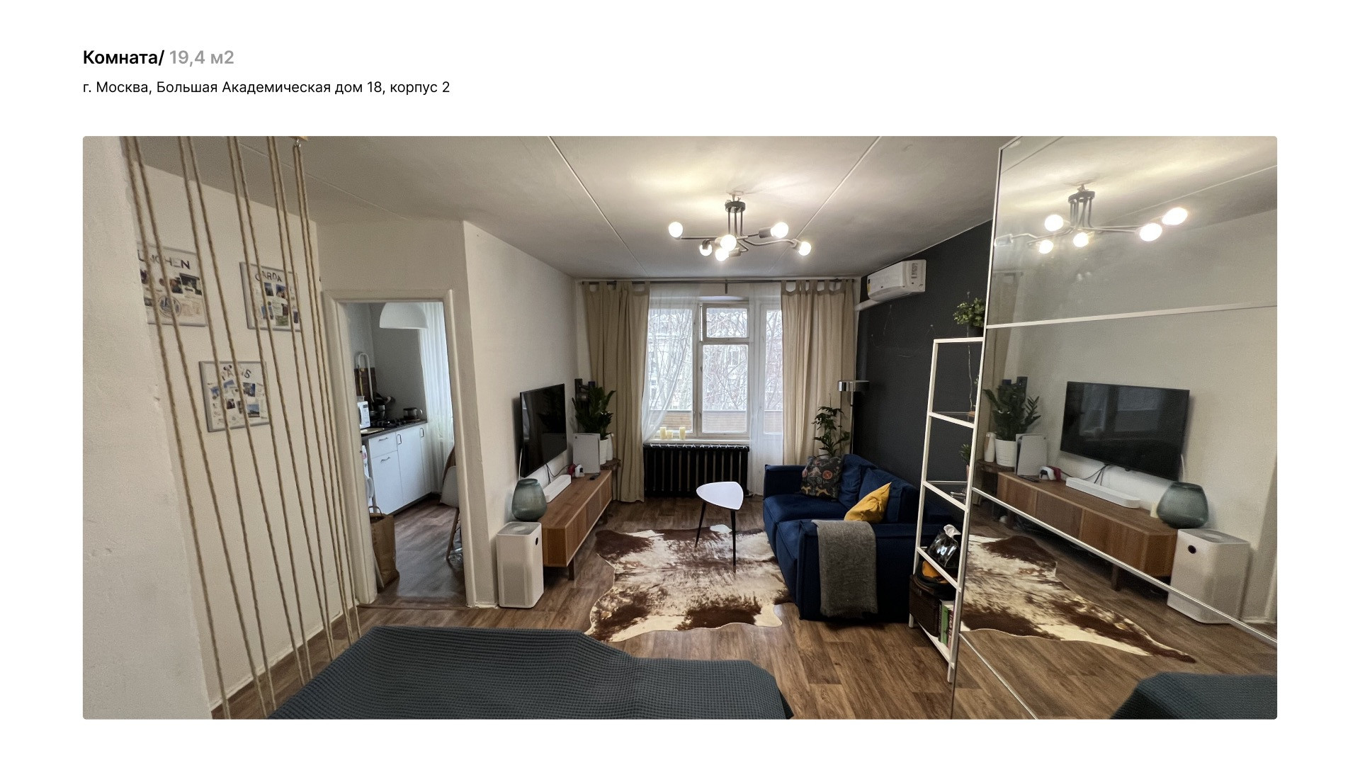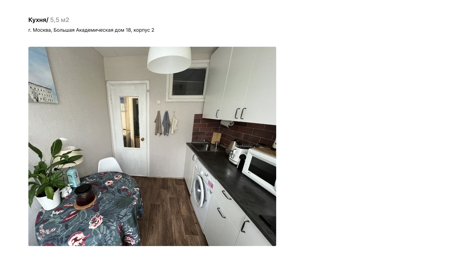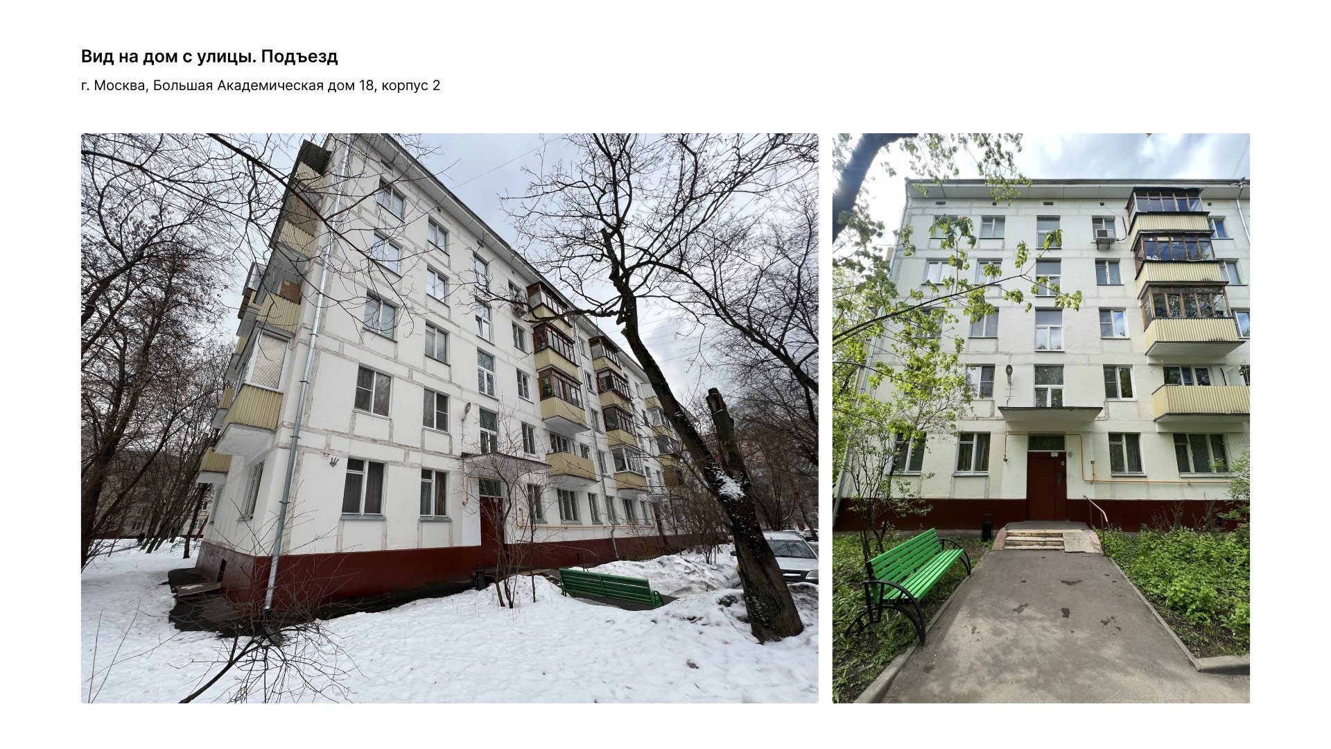 Однокомнатная квартира 31 м2 (площадь с балконом  33,8 м2) на 5 этаже пятиэтажного дома по адресу ул. Большая Академическая 18к2. Окна квартиры выходят на юго-запад, во двор. Летом из окна видны только кроны деревьев, солнцу не мешают. Дом расположен в тихом районе Коптево в шаговой доступности от Тимирязевского лесопарка, вход в парк 150 м от дома. Дом газифицирован. В программу реновации не входит.