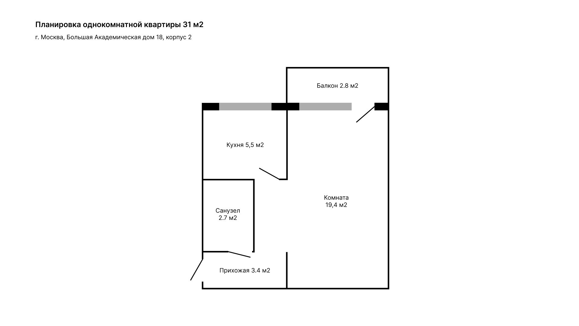 Площадь комнаты  19,4 м2. Площадь кухни  5,5 м2. Площадь санузла  2,7 м2.