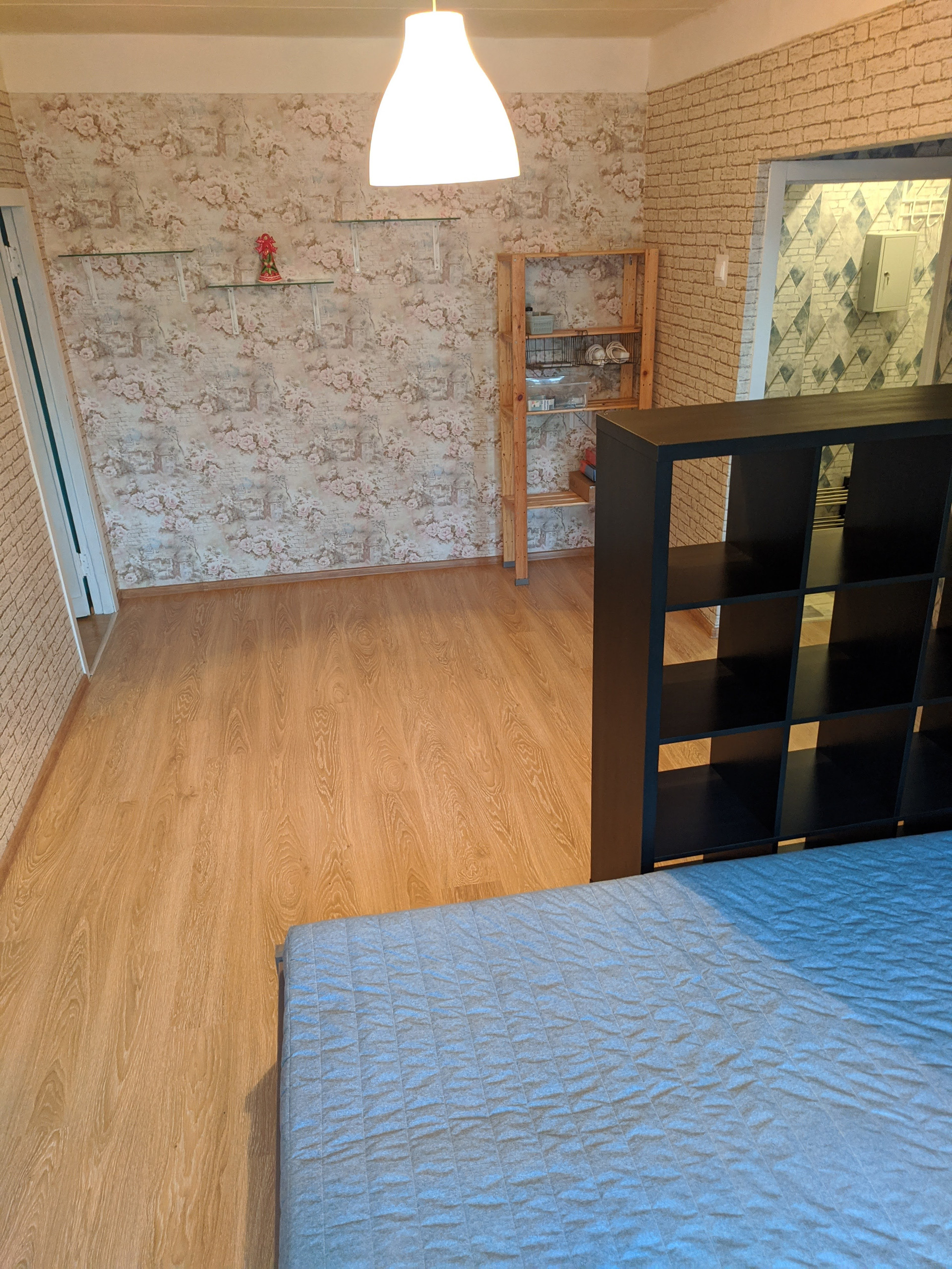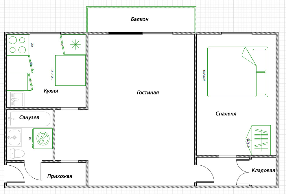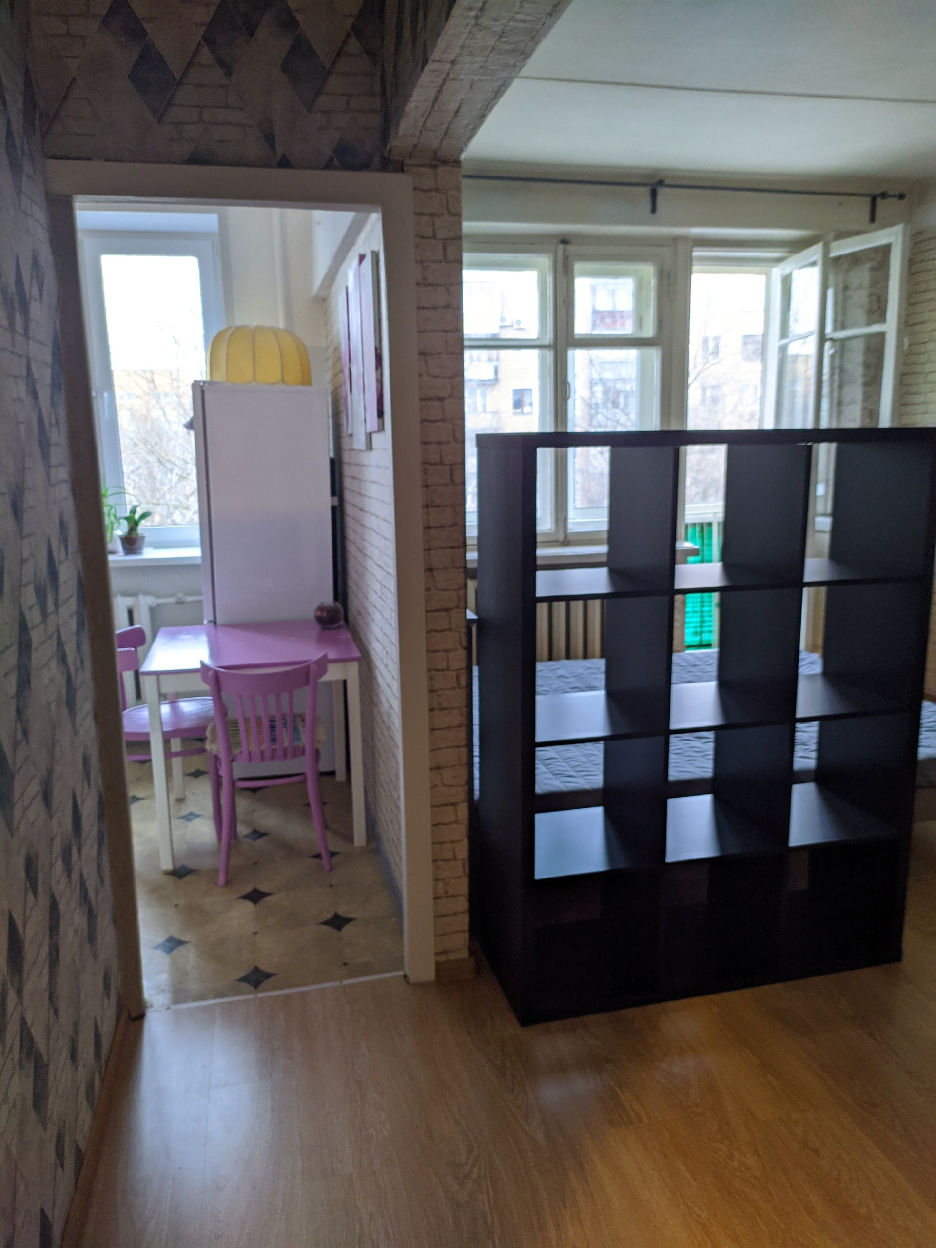 Между кухней и гостиной нет несущей стены, перегородку легко демонтировать.