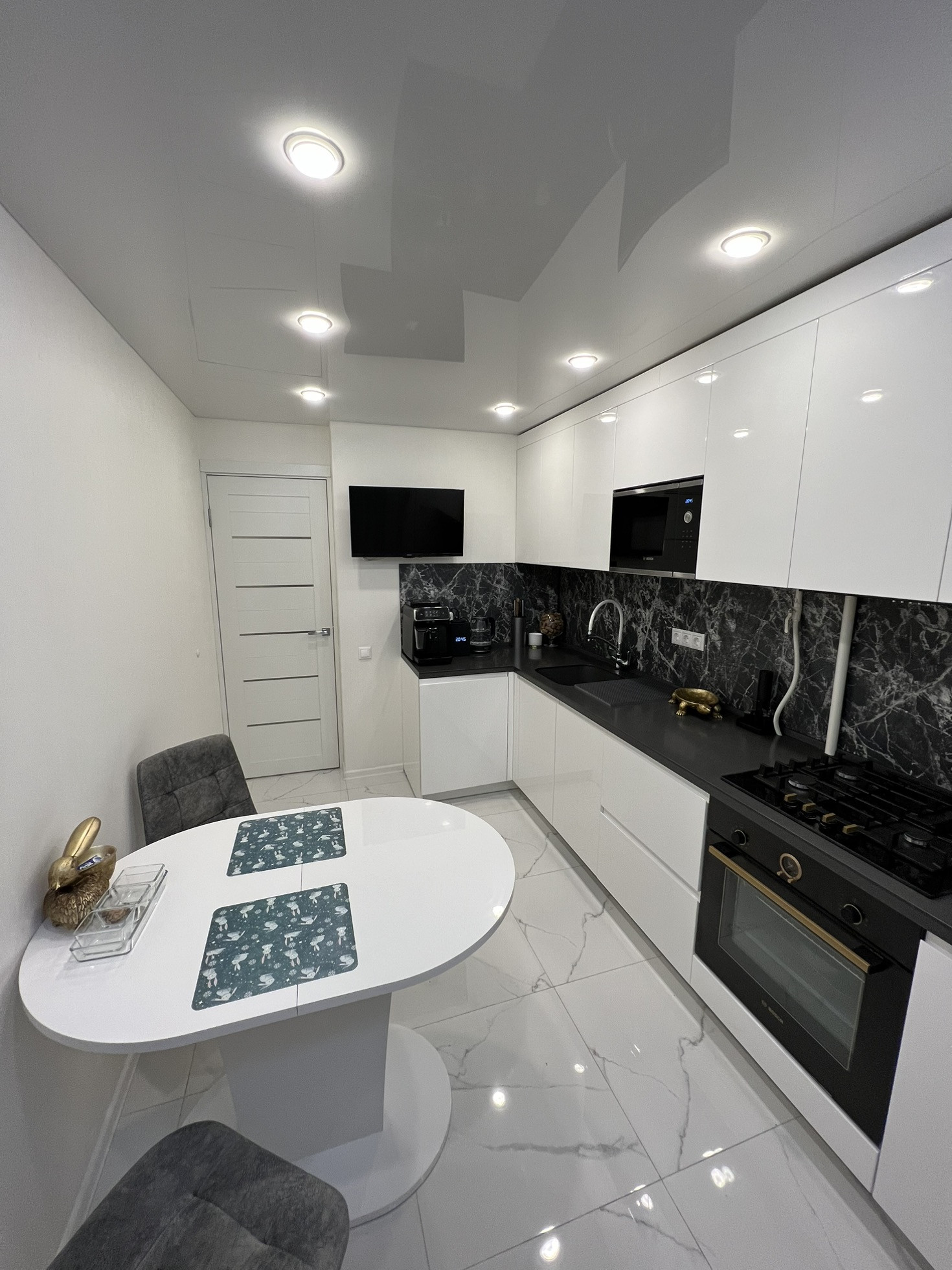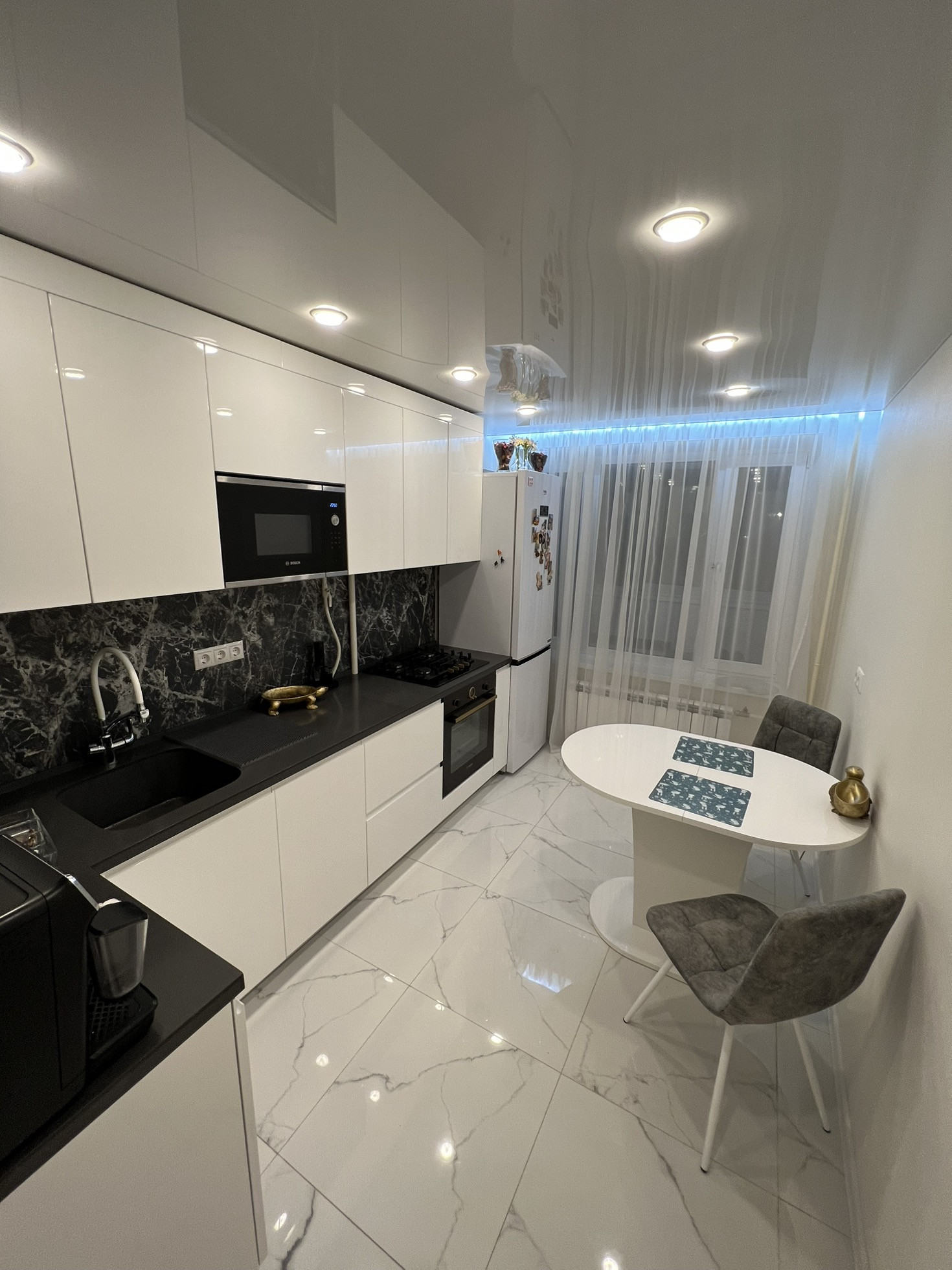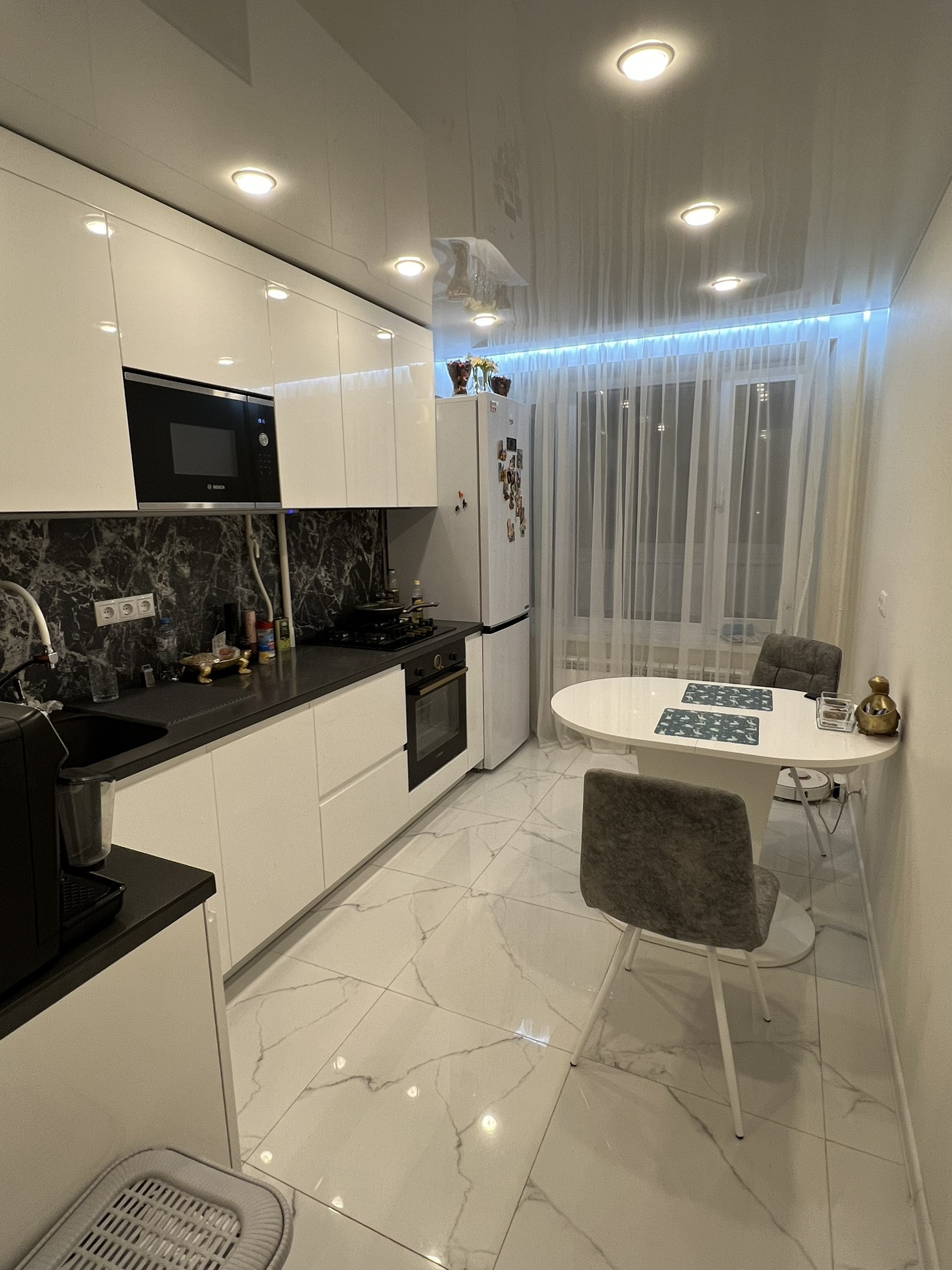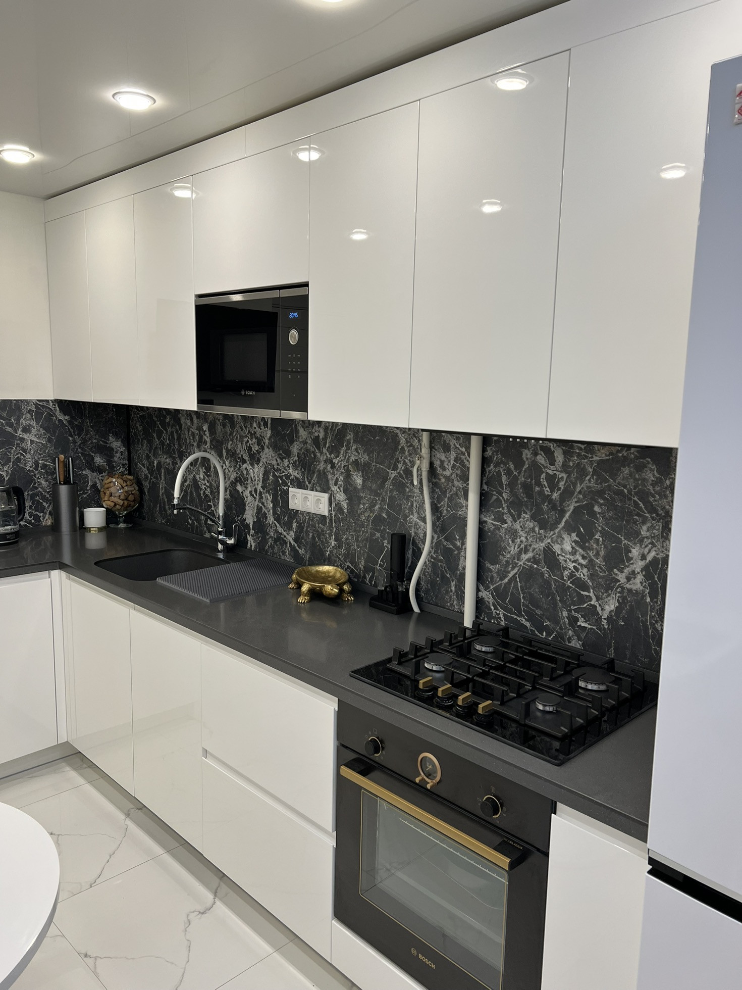 - кухонный гарнитур с встроенной техникой bosh (духовой шкаф, микроволновая печь, варочная газовая панель);