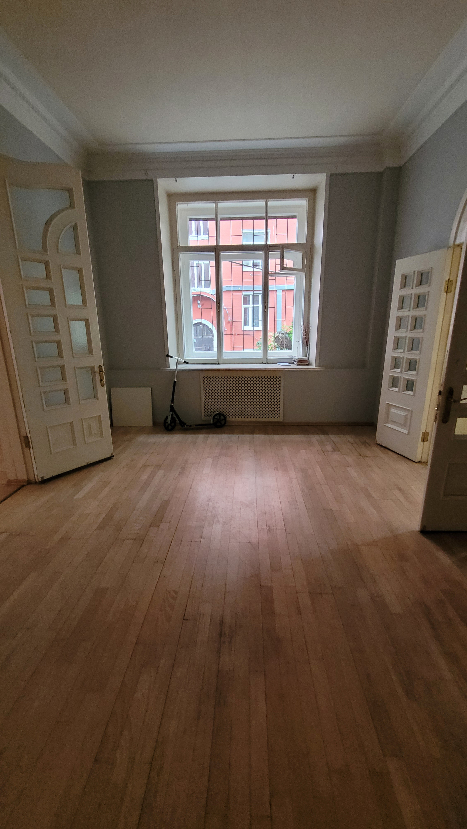 Студия с деревянным окном, которое выходит во внутренний двор