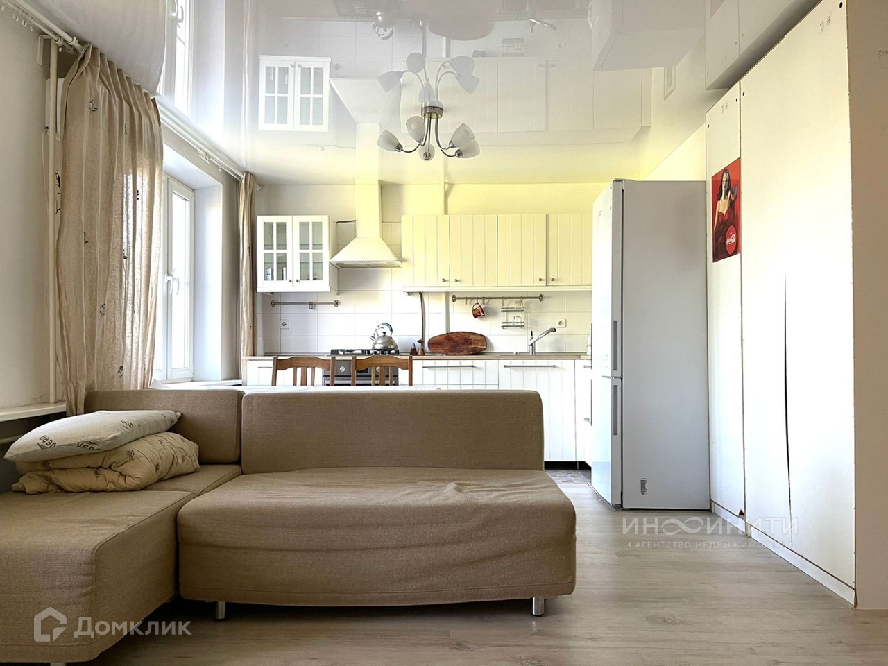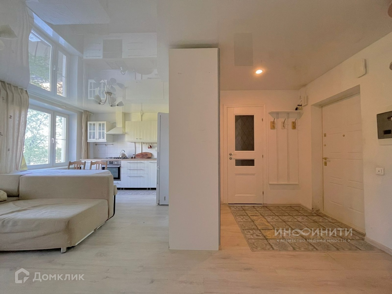 В квартире выполнен качественный ремонт в светлых тонах. Заменена проводка, произведено выравнивание полов и стен. Сделаны натяжные потолки, поставлены пластиковые окна.