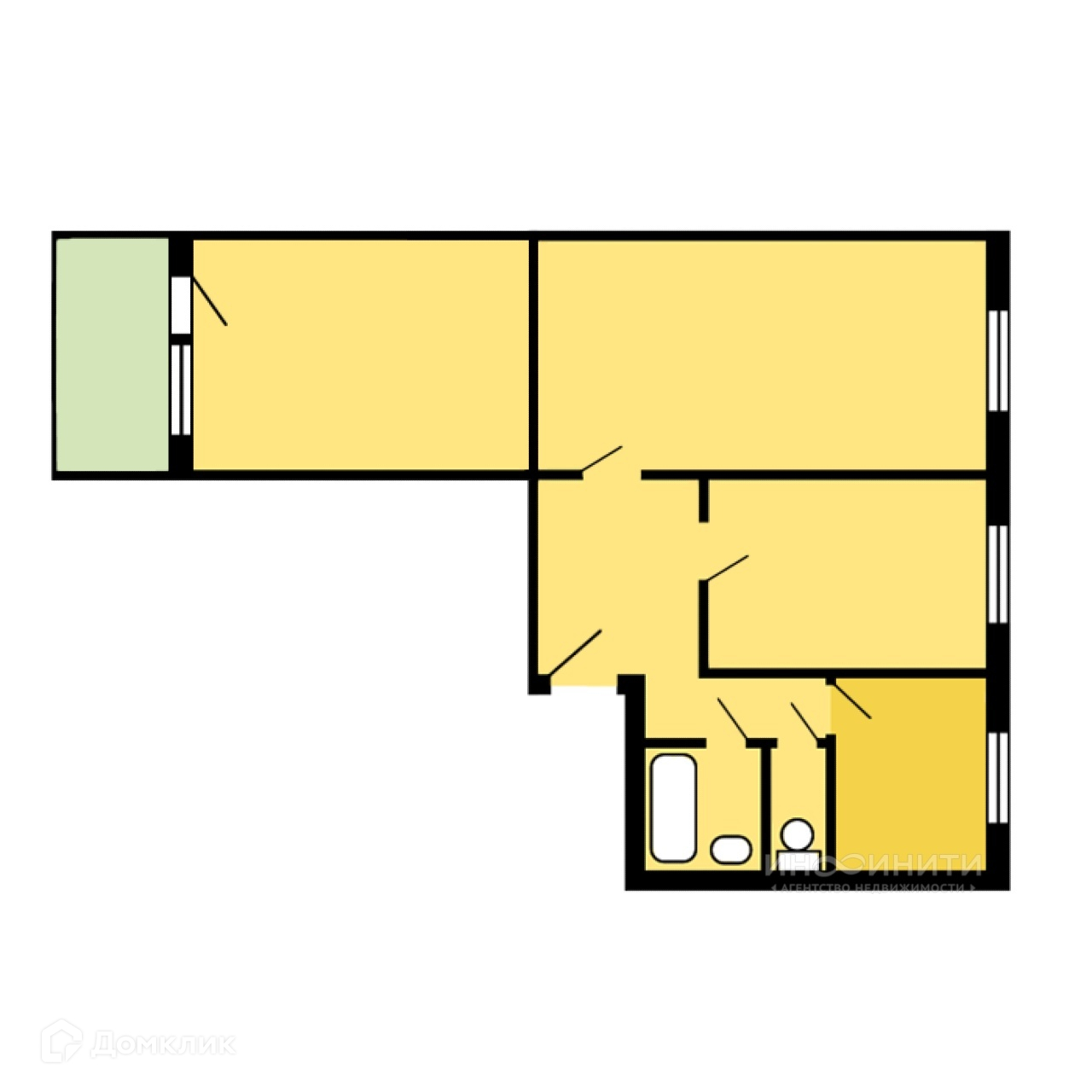 Квартира выходящая окнами на разные стороны дома. Две комнаты являются смежными, так как проход в дальнюю комнату с лоджией через другую комнату. Возможна простая перепланировка, делающая комнаты этой квартиры изолированными, для этого достаточно немного продлить стену коридора, прирезав к нему кусок одной из комнат, это добавит полезное место для кладовки. Санузел раздельный.