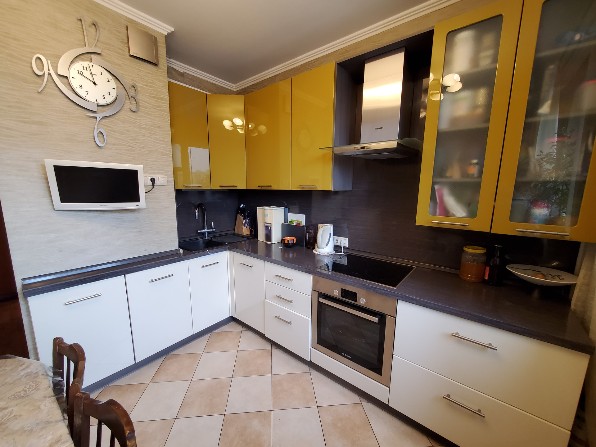 Светлая кухня квадратной формы. Встроенный кухонный гарнитур входит в стоимость квартиры.