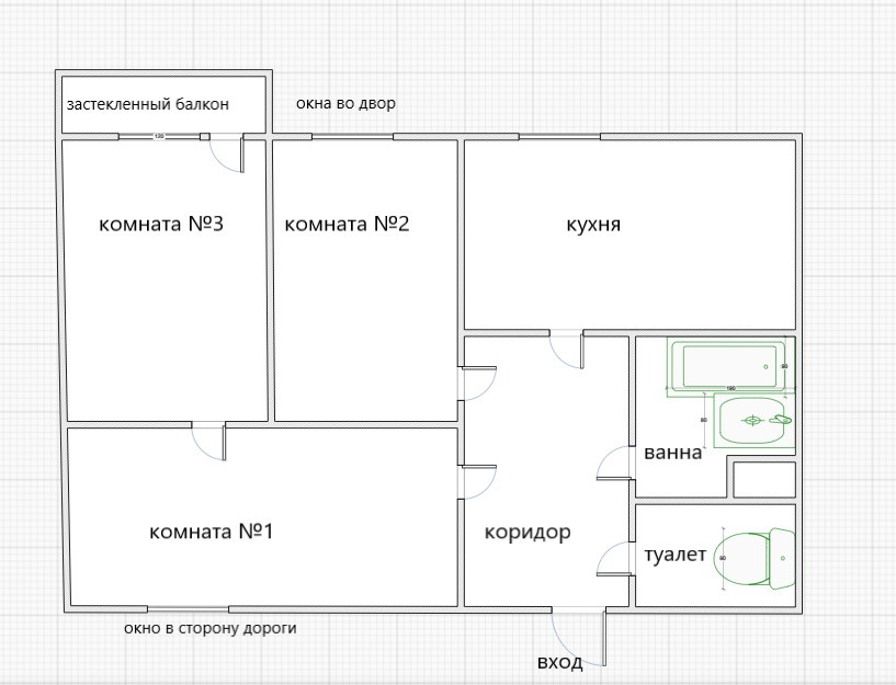 Общая площадь 72.6 кв.м., ( с балконом 73.3кв.м.): просторный коридор 11 кв.м., раздельный санузел, кухня 11.7 кв.м (окно во двор)., 2 раздельные комнаты- 12.8-12.3кв.м. (окна во двор)  и одна проходная 18.5 кв.м. (окно в сторону дороги). В спальне выход на застекленный балкон (панорамные окна в пол, окна во двор). Высота потолка (h) -2.70.