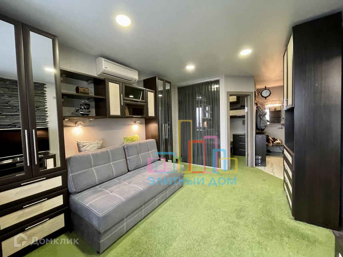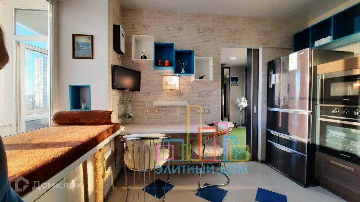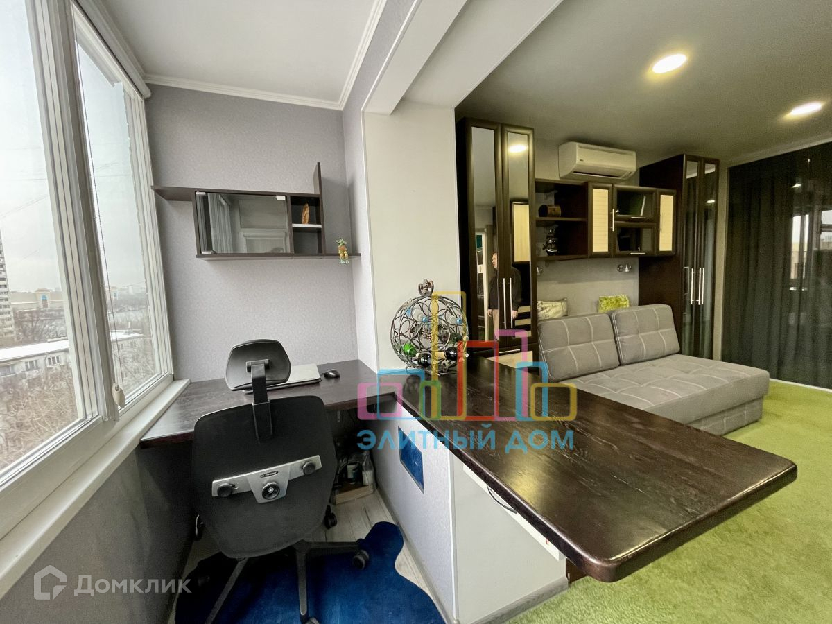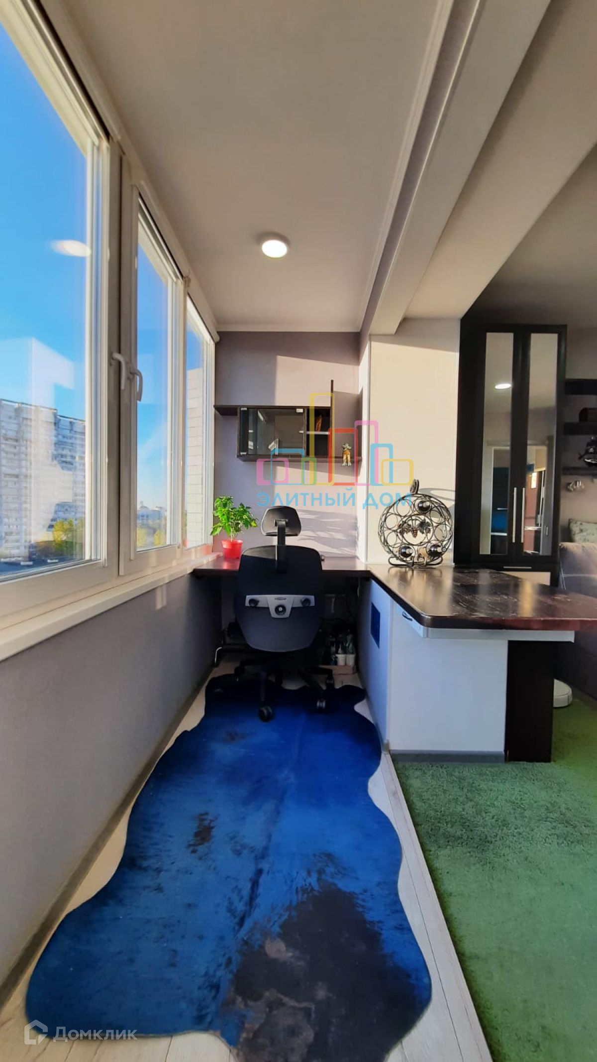 Кухня оборудована всей необходимой мебелью и бытовой техникой и изолируется сдвижной дверью. В зоне гостиной раскладной диван, большое количество шкафов и стеллажей для хранения вещей, установлен кондиционер и телевизор. Часть лоджии присоединена, утеплена и переоборудована под рабочее место с офисным креслом, предусмотрены теплые полы. Изолированная спальня.