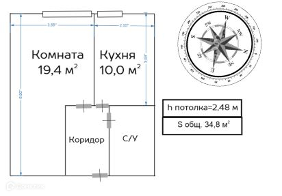 Общая площадь 34.8 м2