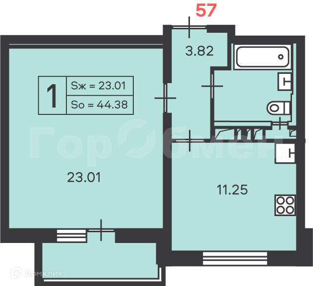 Общая площадь 44.38 м2