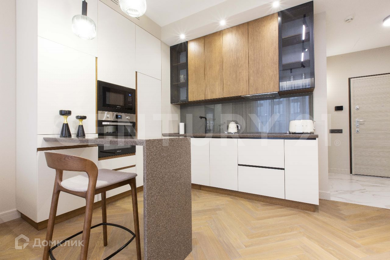 Отделка выполнена с использованием натурального дерева, полностью "под ключ" с мебелью и техникой. Светлый интерьер оформлен в современном стиле и придает апартаментам уют и визуальное расширение пространства.