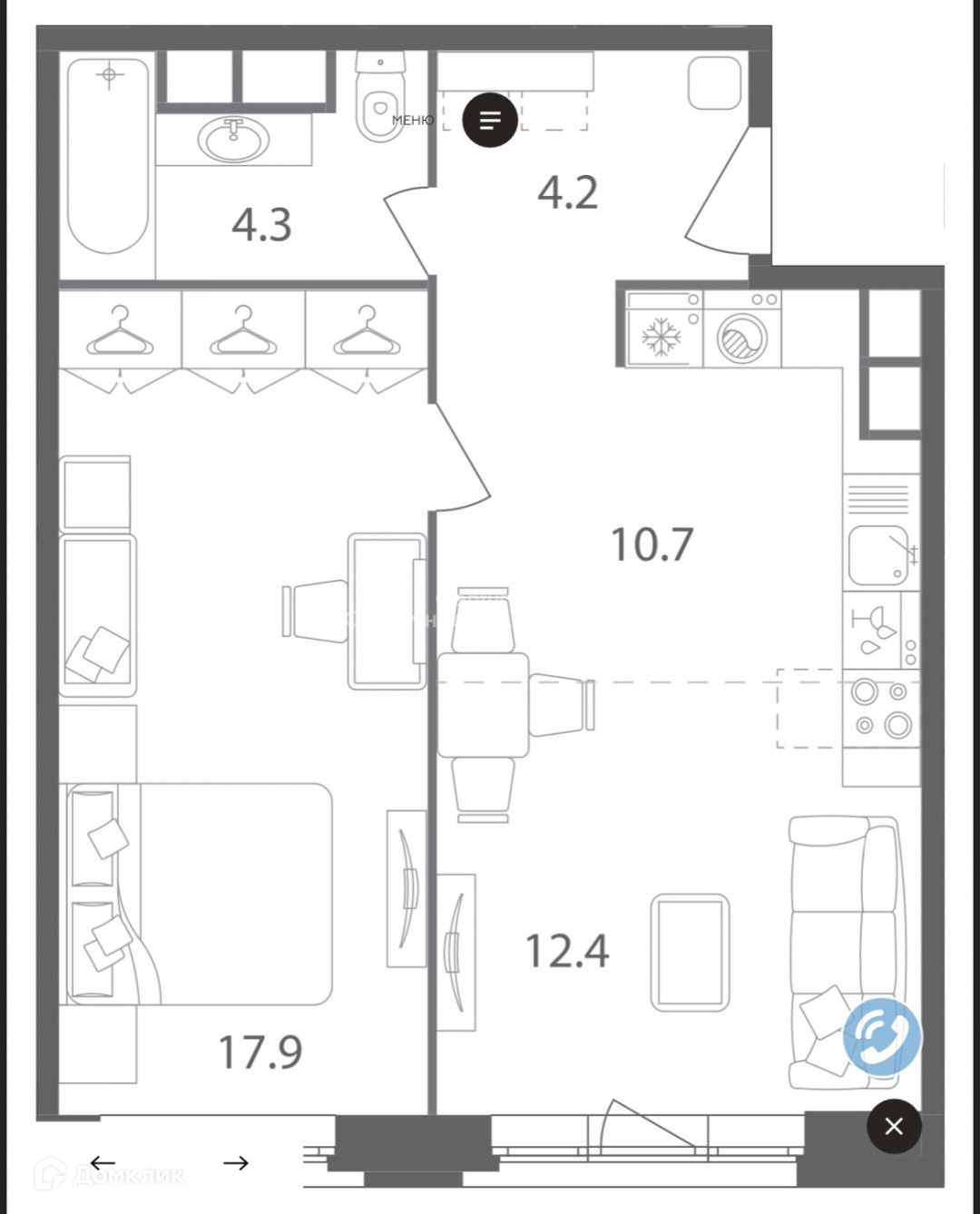 Общая площадь 49,3 кв.м. Комната 17,9 кв.м и очень просторная гостиная-кухня 22,9 кв.м. Квартира без отделки, свободной планировки. Это позволит вам спланировать пространство, зоны и дизайн на свой вкус. Высокие потолки от 3.5 м благодаря последнему этажу корпуса. Балкон не предусмотрен. Панорамные окна, вид на восток (парк Остров мечты, метромост и частично на Москва-реку)