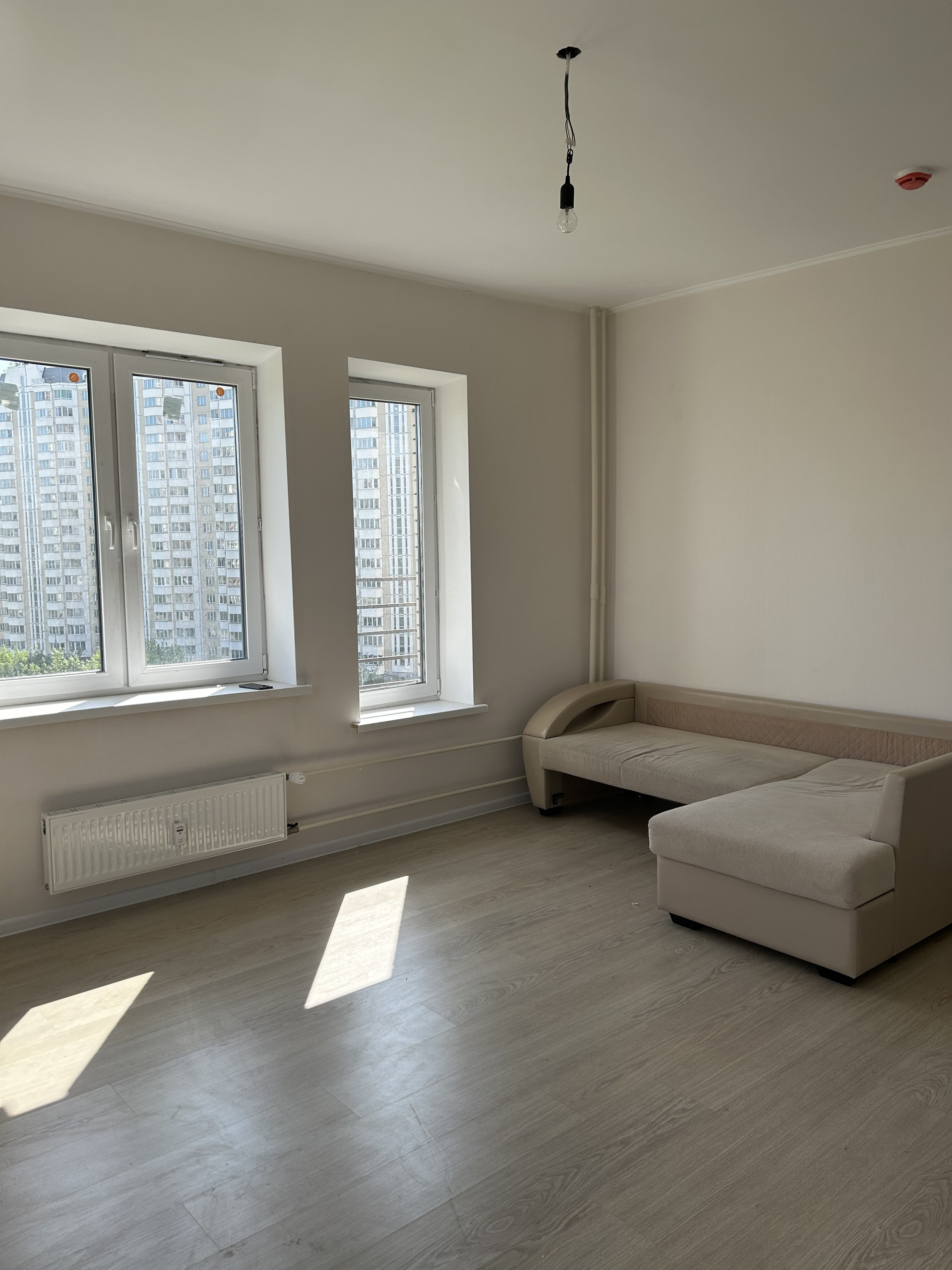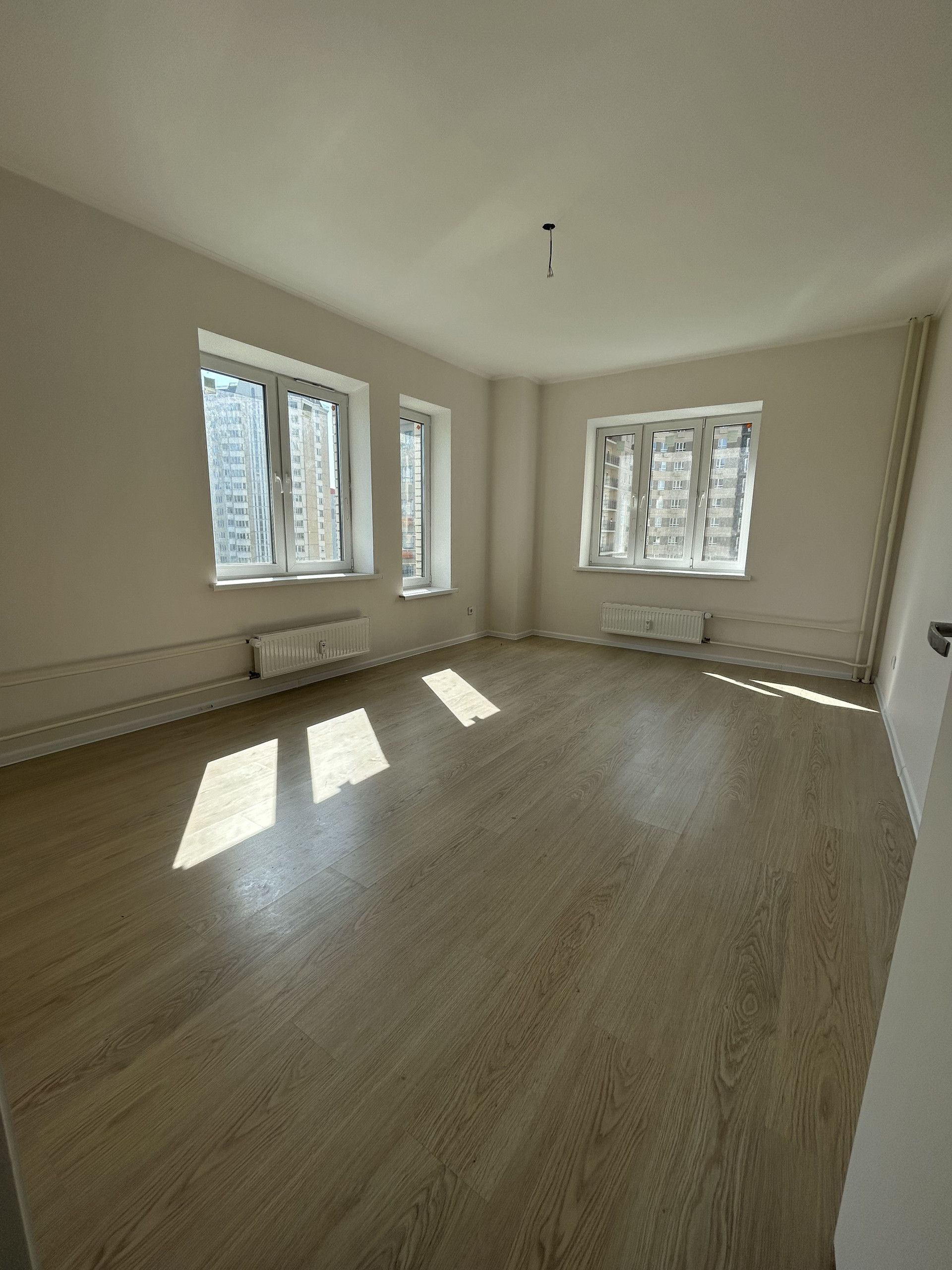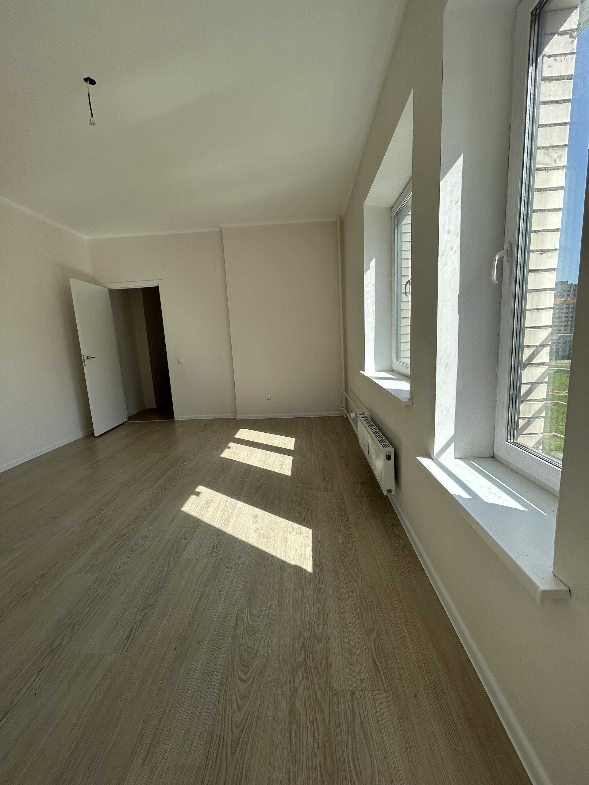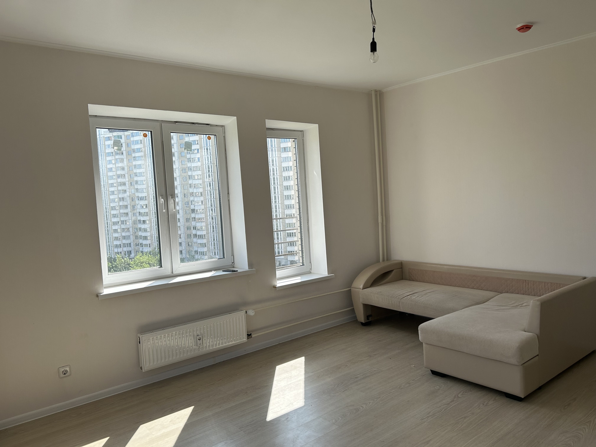 В квартире выполнен ремонт в теплых тонах. Установлена кухня. Очень светлая за счет множества окон.