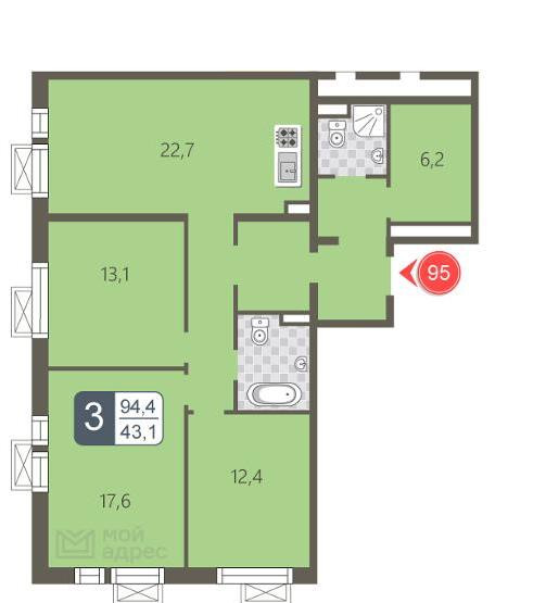 Жилая площадь 43.1 м2