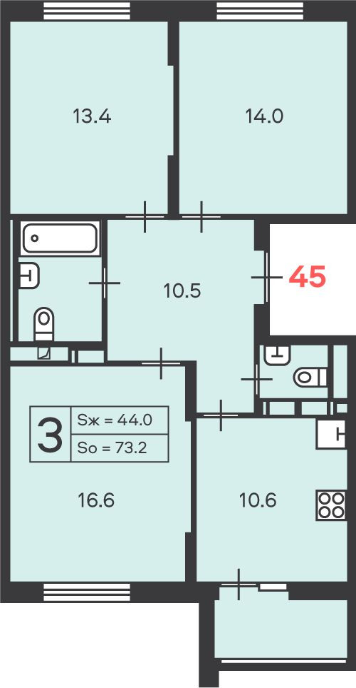 Общая площадь 72.9 м2