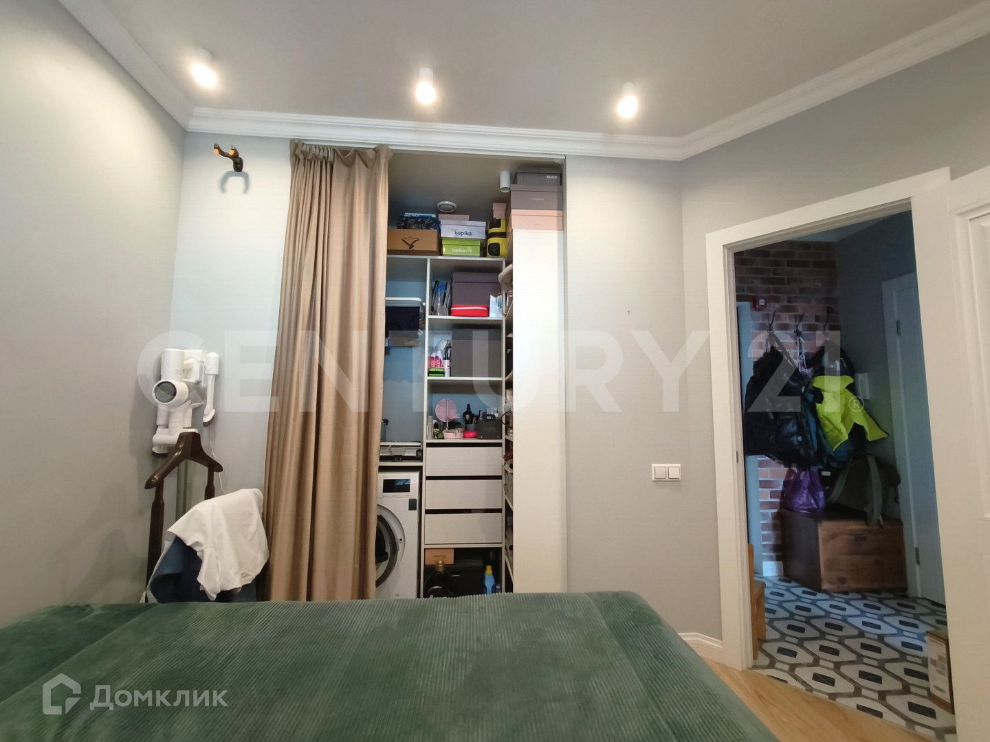Удобная планировка квартиры. Большая комната разделена перегородкой на две зоны: можно использовать пространство как спальня-детская или спальня-кабинет.  В спальне оборудован небольшой гардероб с местом для стиральной машины, сушилкой и встроенной гладильной доской. В санузел установлен гигиенический душ.