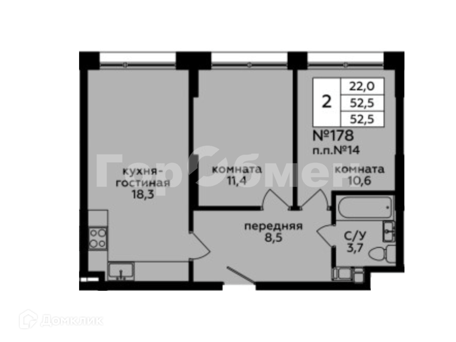Общая площадь 52.5 м2