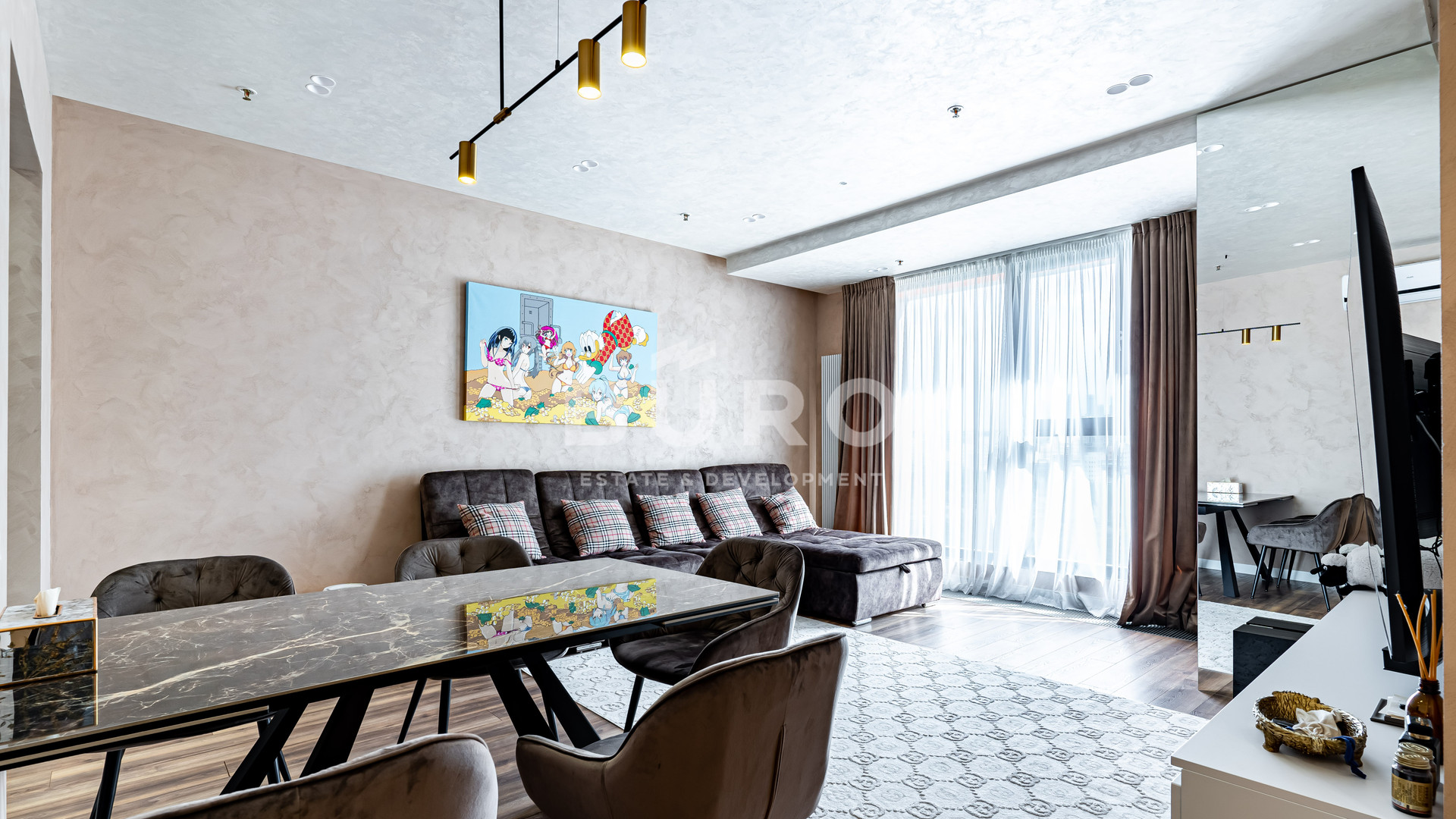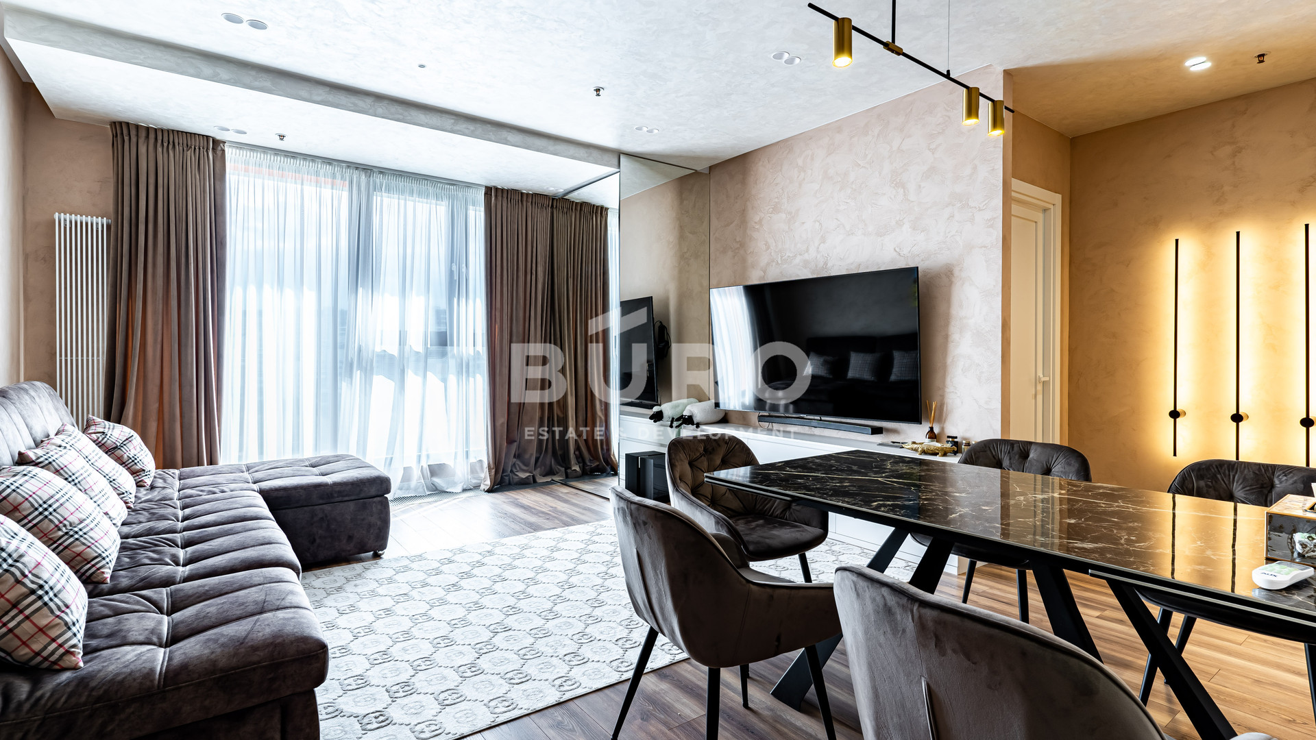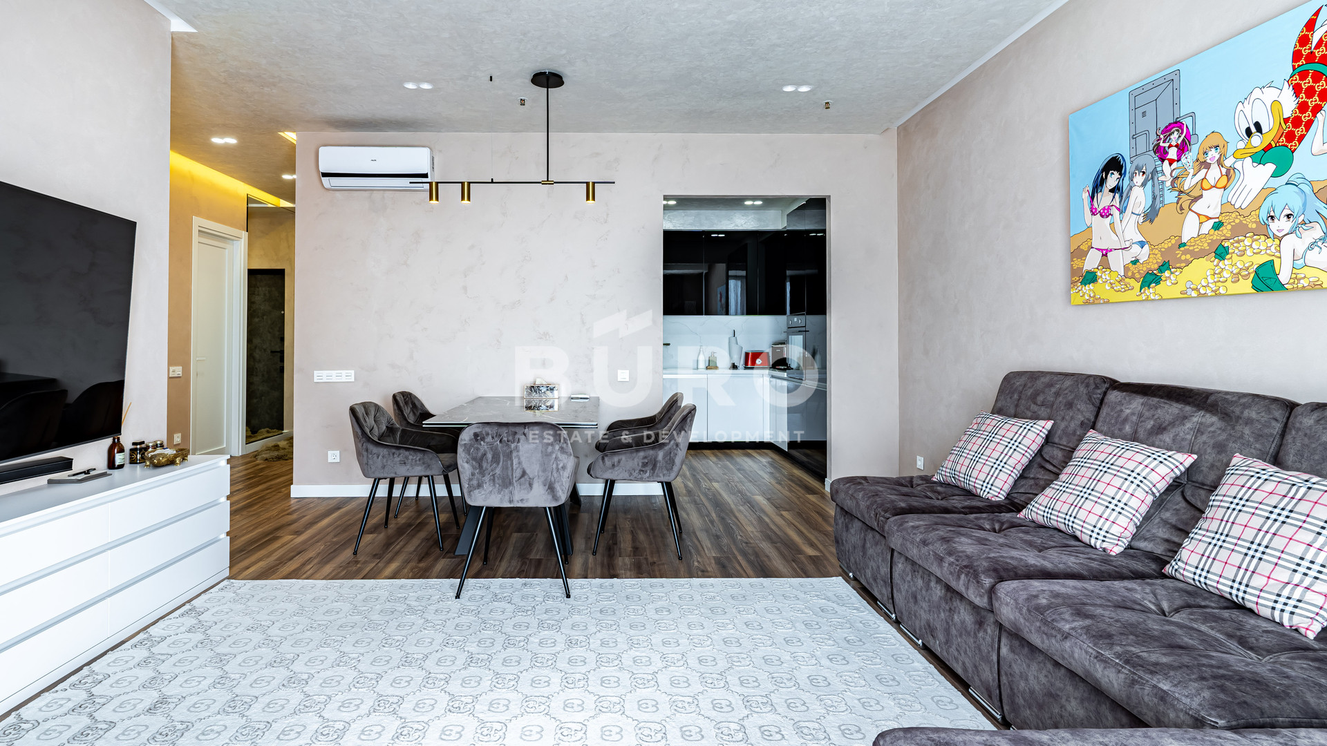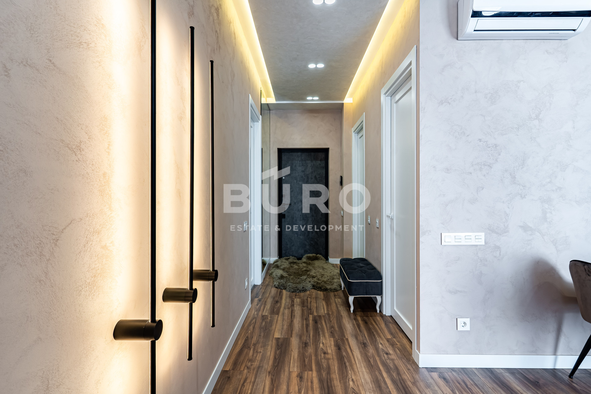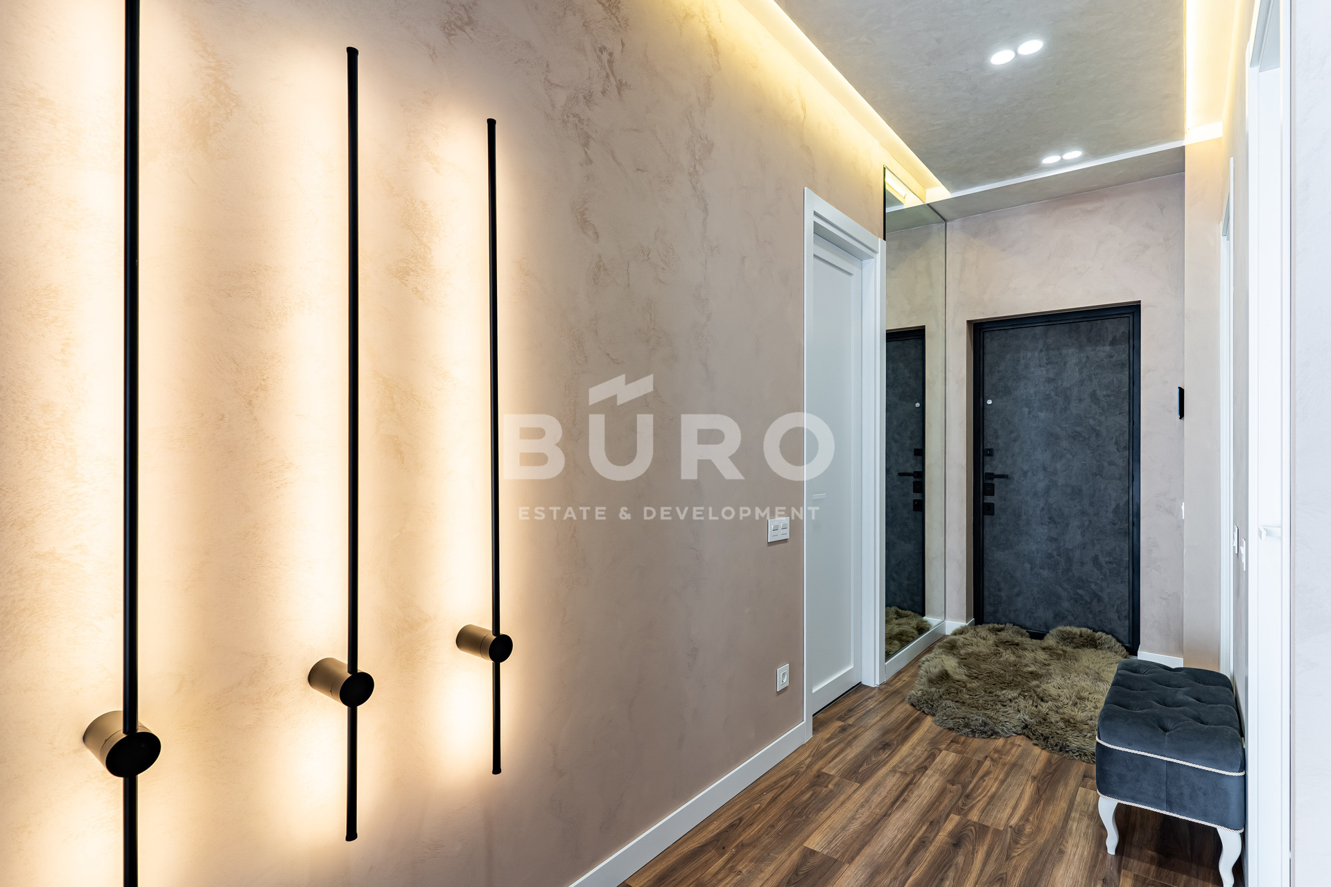 В апартаментах выполнен качественный дизайнерский ремонт из материалов ведущих европейских производителей. Полностью под ключ. Встроенная кухня, бытовая техника. Постирочная комната 2,2 кв.м. со стиральной и сушильной машинками. Две гардеробных комнаты, в коридоре и в спальной комнате. Установлены панорамные окна в пол (все окна заменены на новые). Великолепный вид на Ходынское поле.