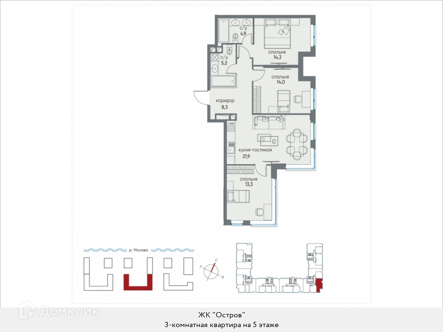 Продаю просторную 3-комн. квартиру площадью 81.9 кв.м., без отделки, на 5 этаже из 13 в жилом комплексе бизнес-класса "Остров". Угловая квартира, такая планировка отлично подойдет всем любителям панорамных видов и тишины. В квартире два совмещенных санузла. Высота потолков 3.25 м.