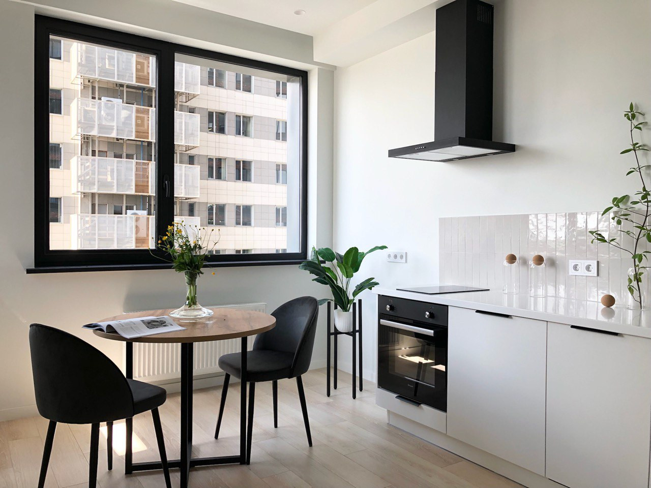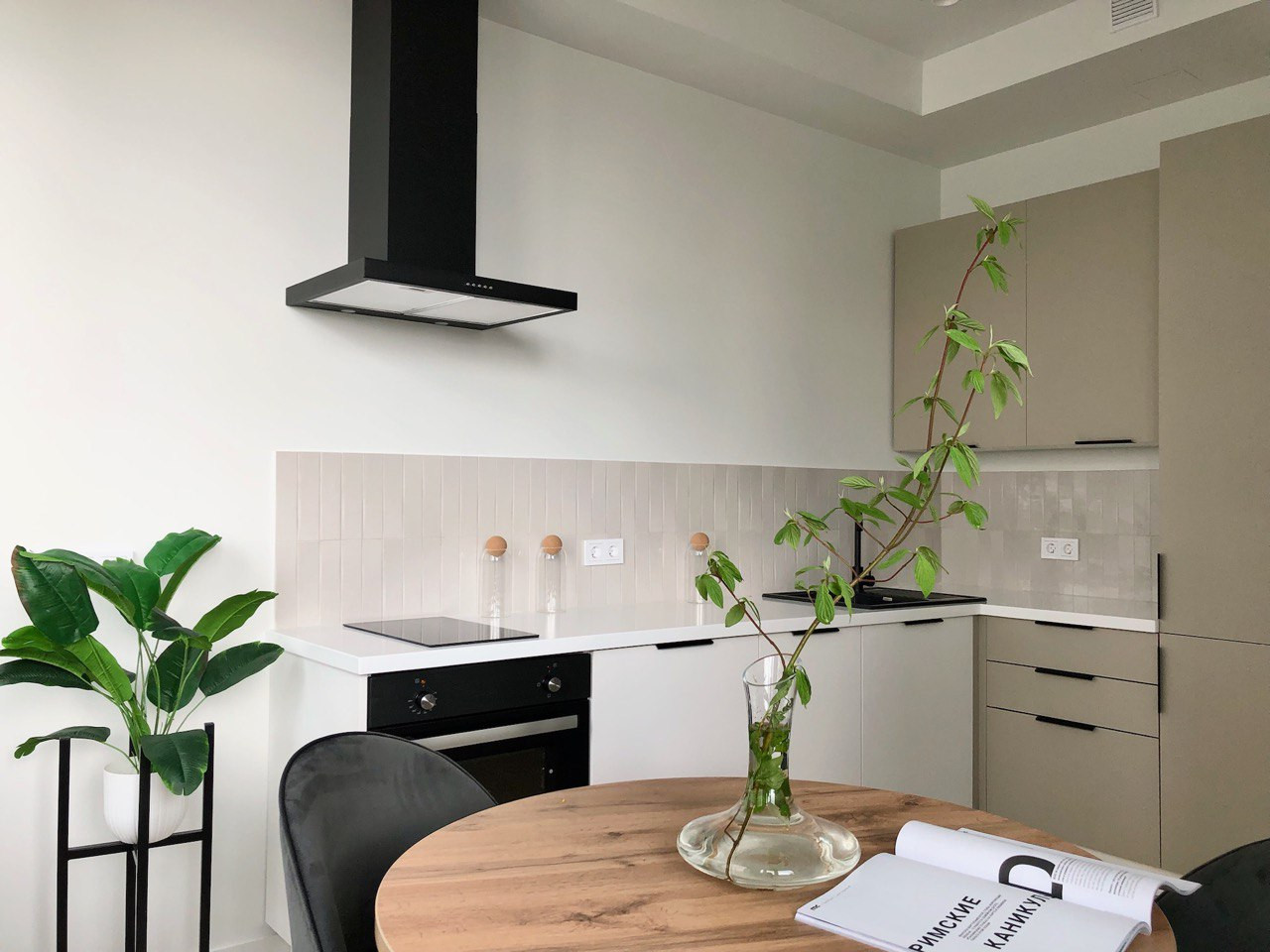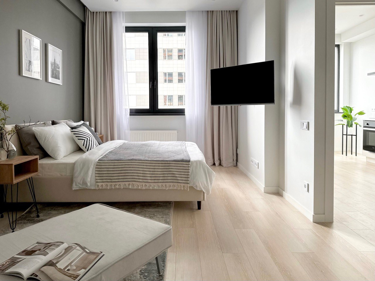 Стильная кухня укомплектована всей необходимой техникой, с рабочей поверхностью из камня. В комнате и гардерабной закуплена вся современная мебель.