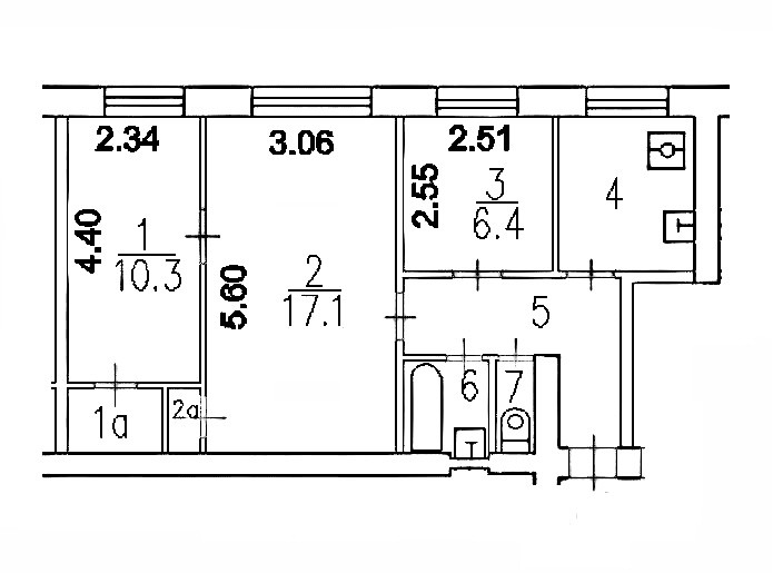 ✔Планировка (кв.м.): общая площадь 52.4, жилая площадь 3.8, комнаты смежно-изолированные 6.4, 17.1 и 10.3, кухня 6.4. С/у раздельный. Балкона нет.