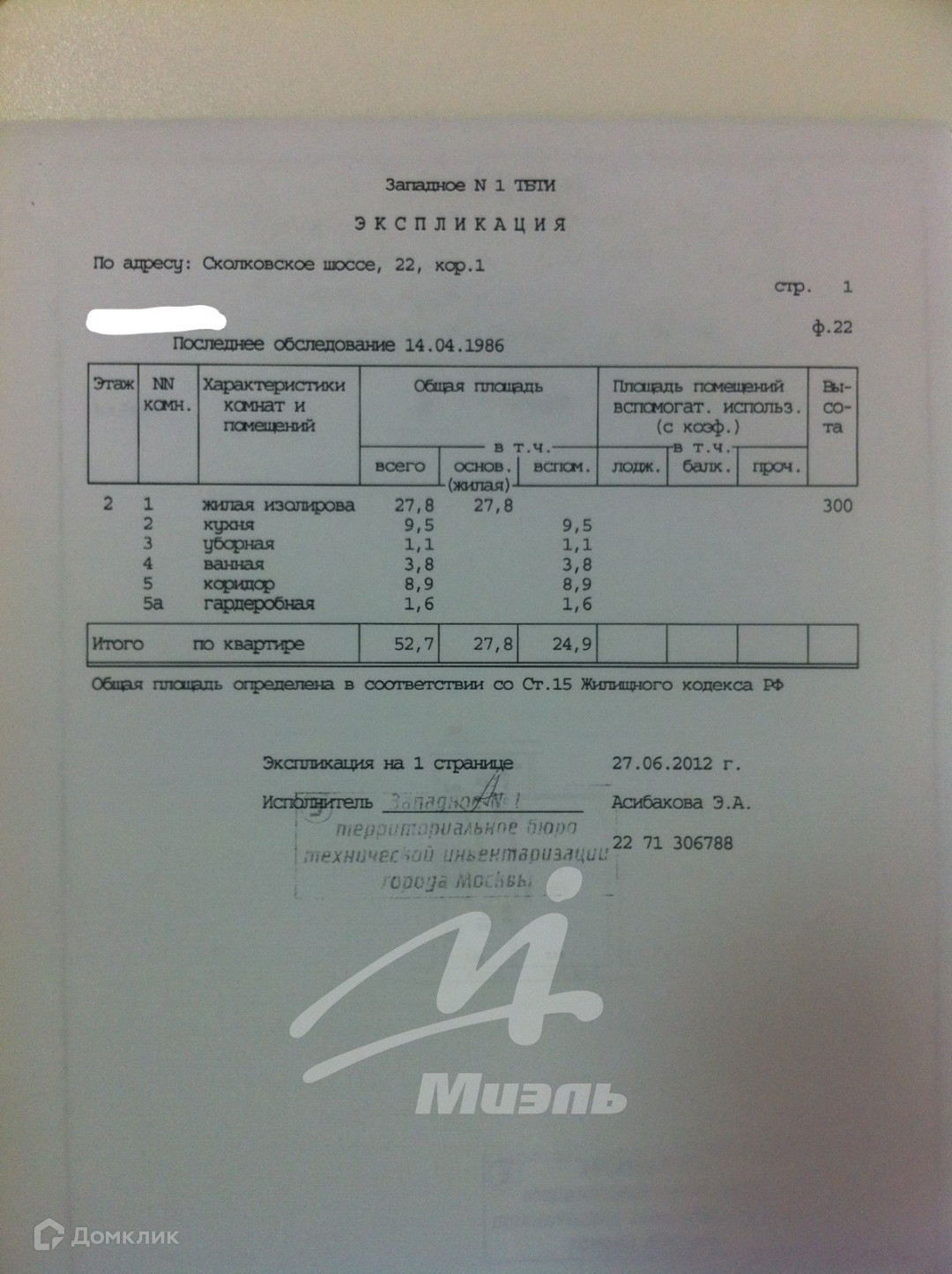 1-комнатная квартира, 53 м2, этаж 2 / 5, на продажу в Москве, Сколковское шоссе, 22к1