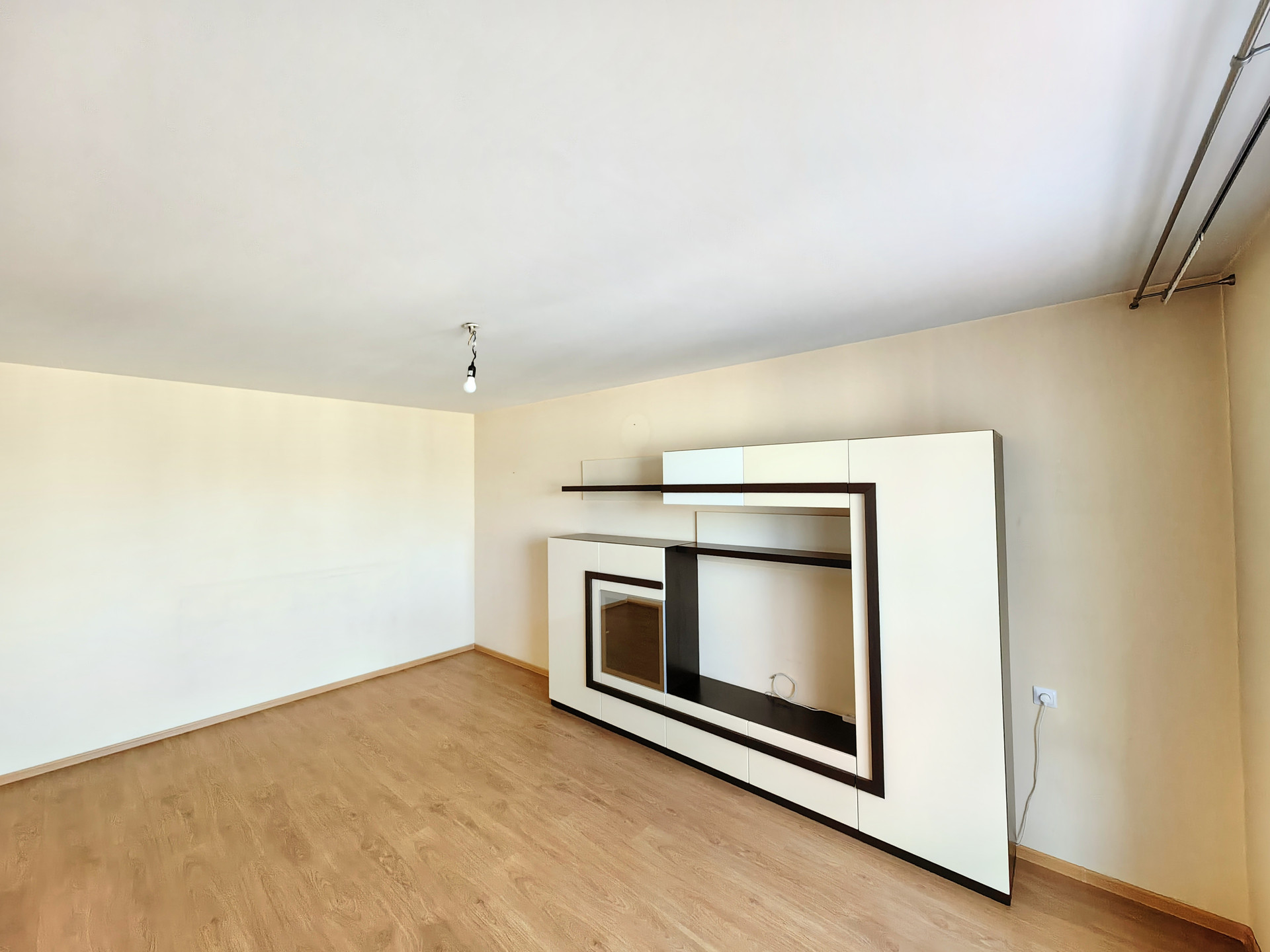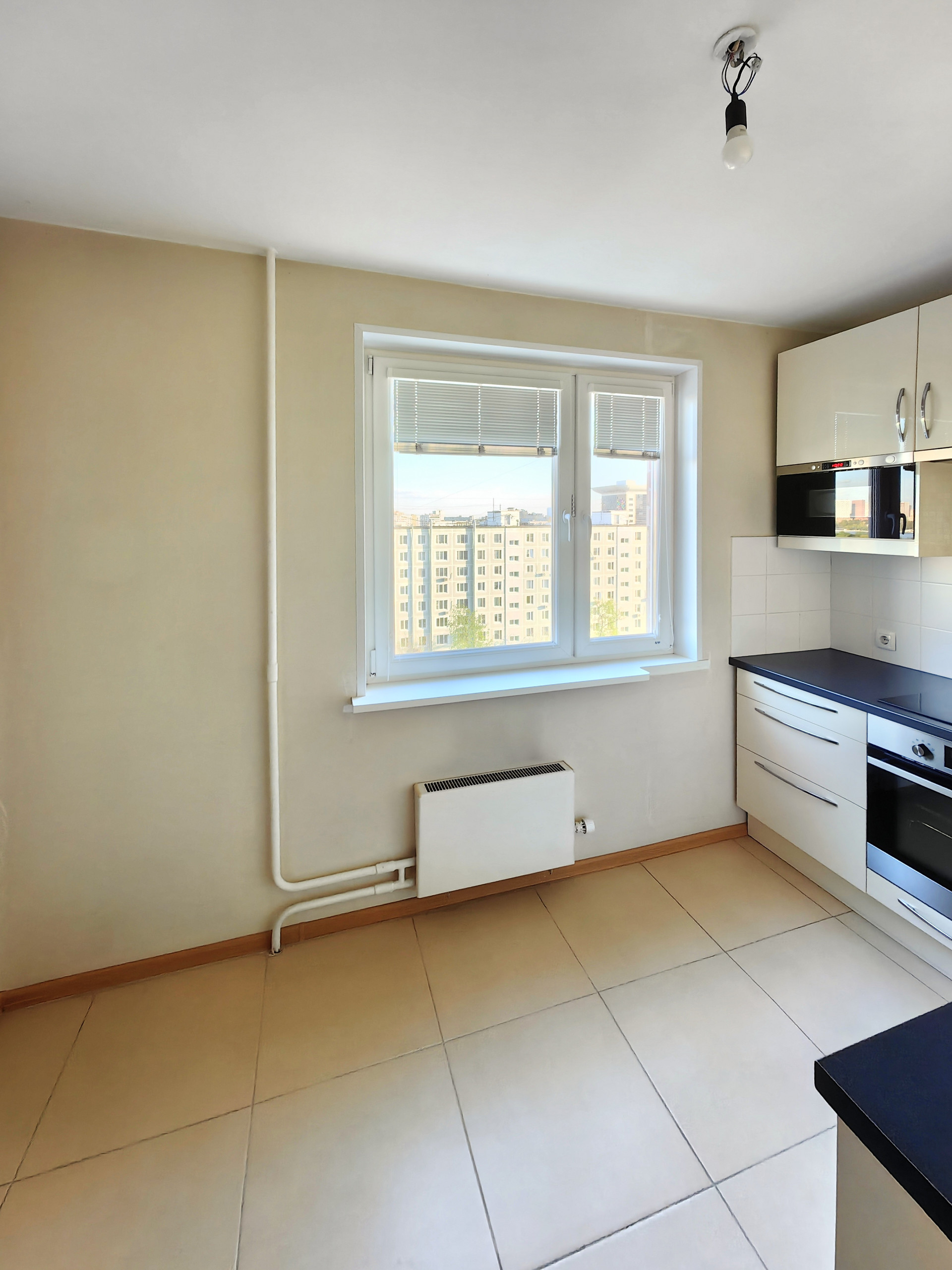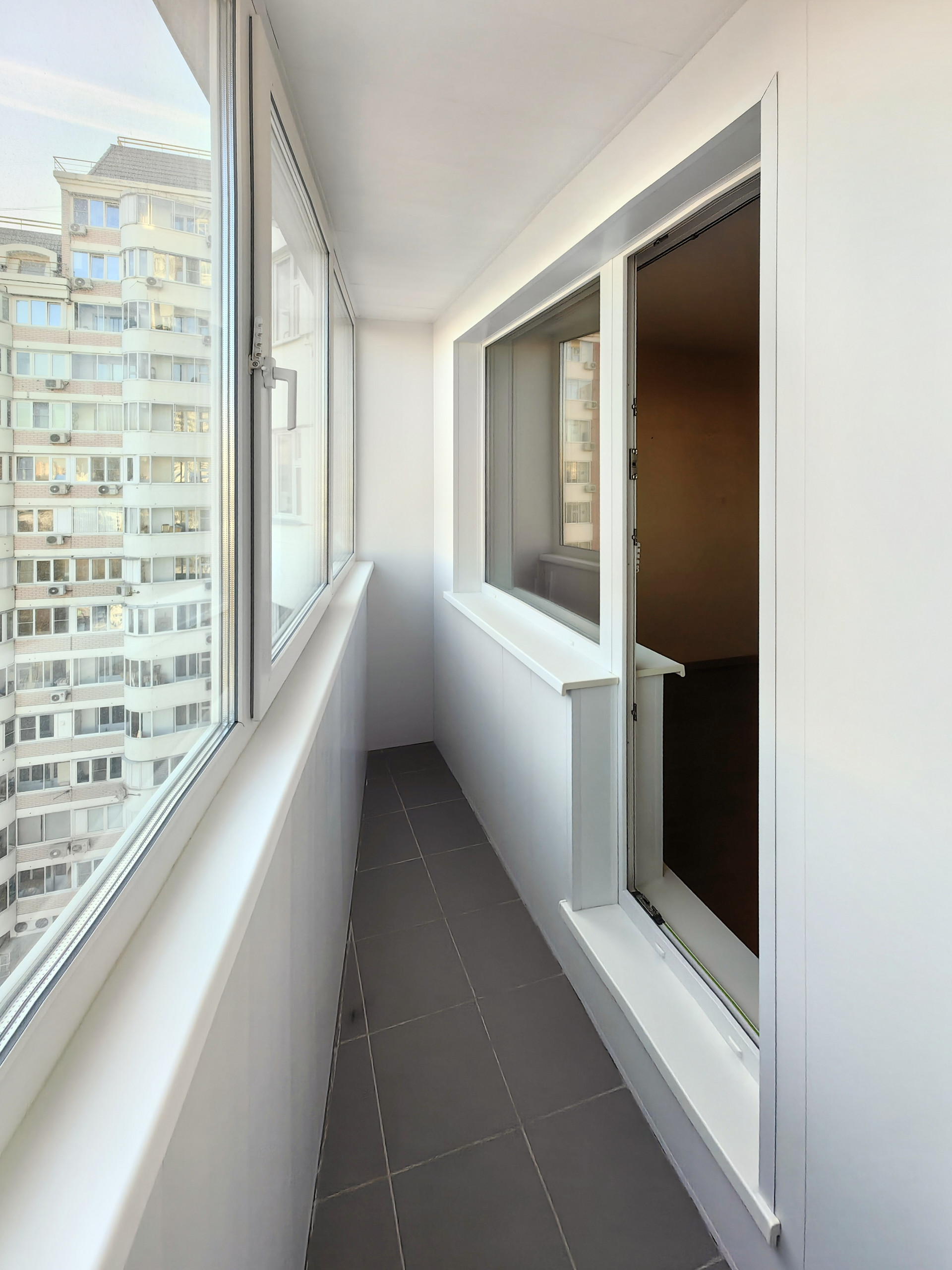 Полы: кухня, санузел, коридор — плитка, комната — ламинат. Потолок — покраска. Обои под покраску. Балкон — отделка стеновыми панелями, не утеплен, соседний балкон отделен стеной из армированных блоков.