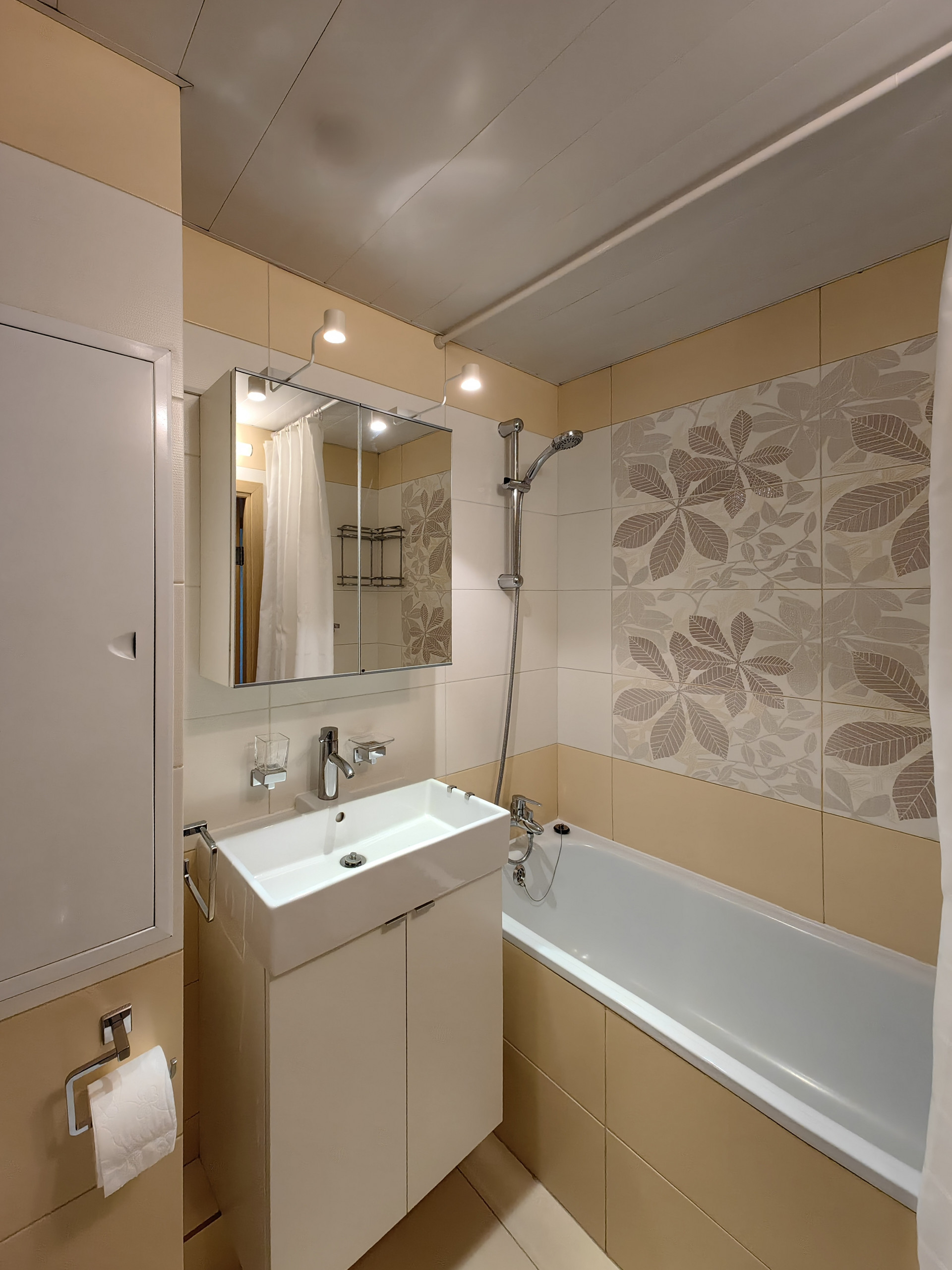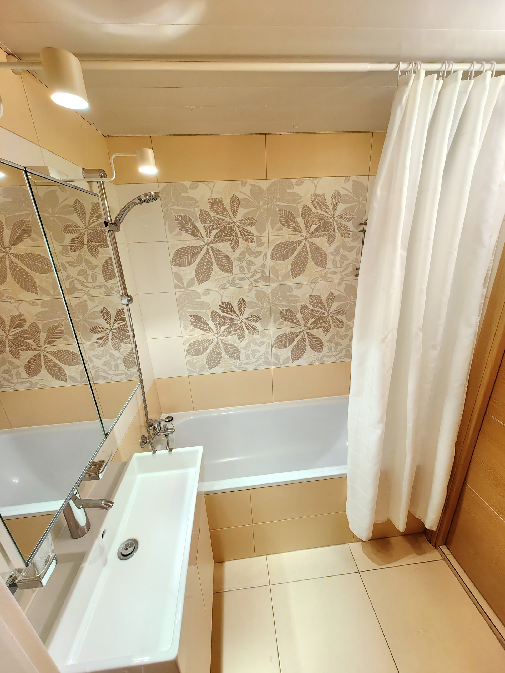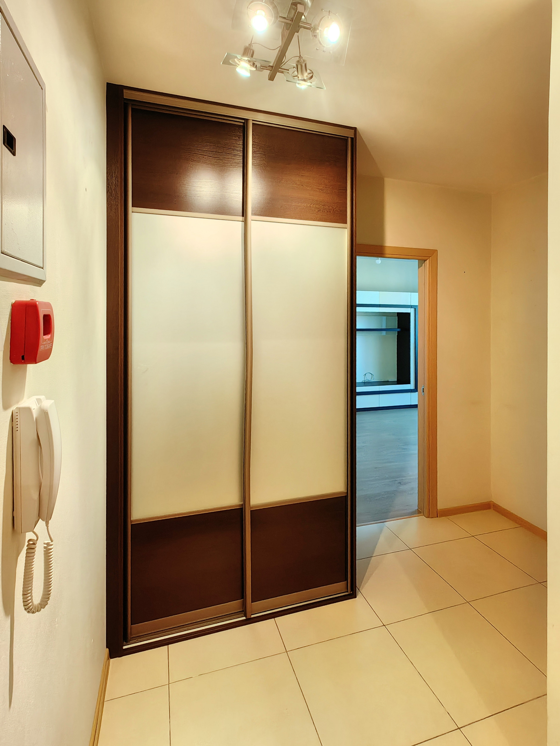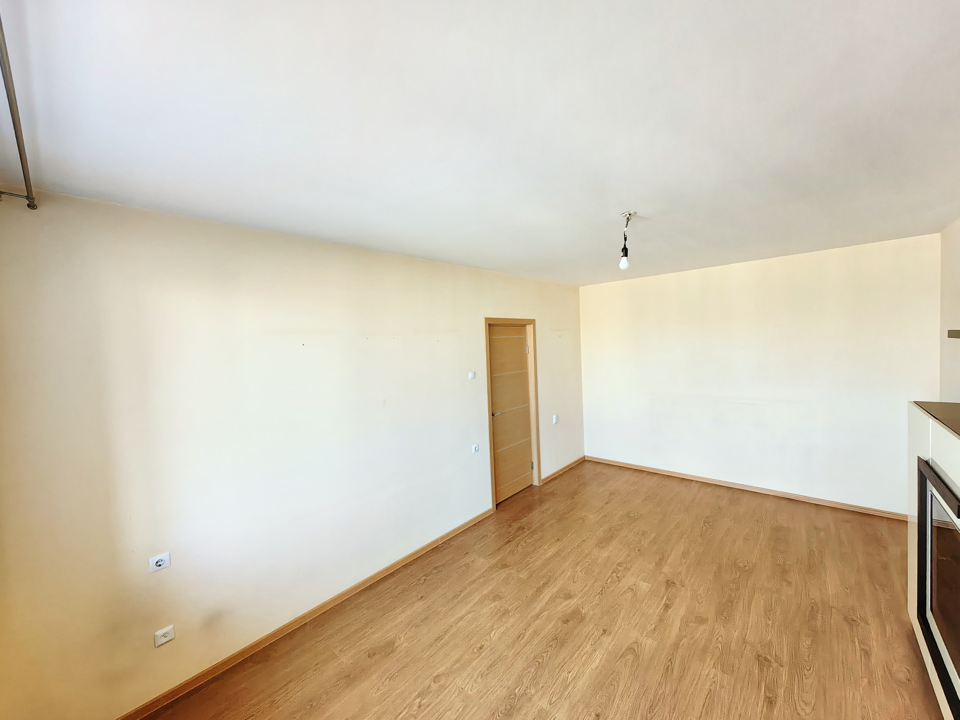 Полы: кухня, санузел, коридор — плитка, комната — ламинат. Потолок — покраска. Обои под покраску. Балкон — отделка стеновыми панелями, не утеплен, соседний балкон отделен стеной из армированных блоков.