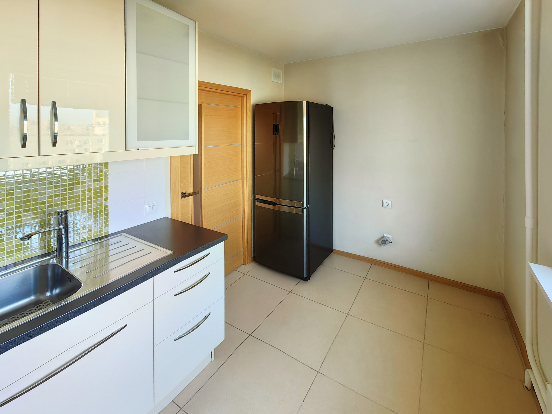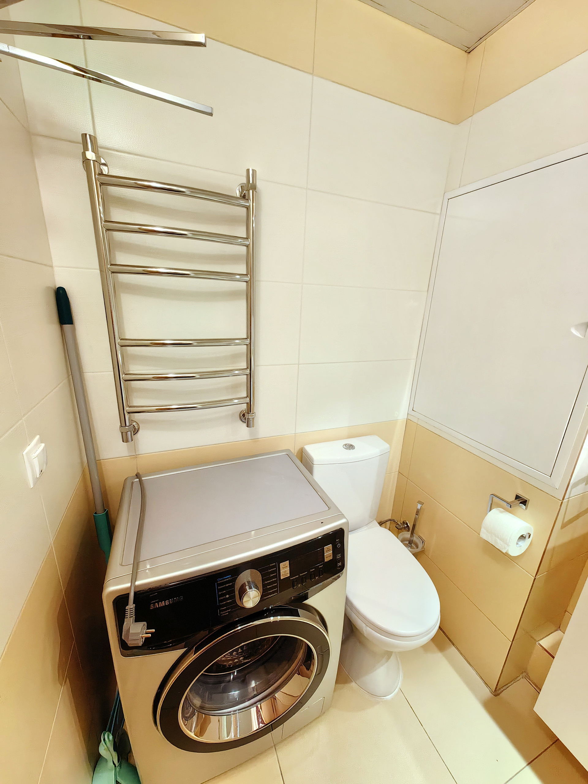 В квартире установлена кухня Икея со всей бытовой техникой (СВЧ, духовой шкаф, индукционная панель) и отдельно стоящий холодильник (Samsung). В жилой комнате гостиная «Ангстем». В прихожей 2 шкафа-купе. В санузле стиральная машина Samsung (на 6 кг), зеркальный шкаф, аксессуары.