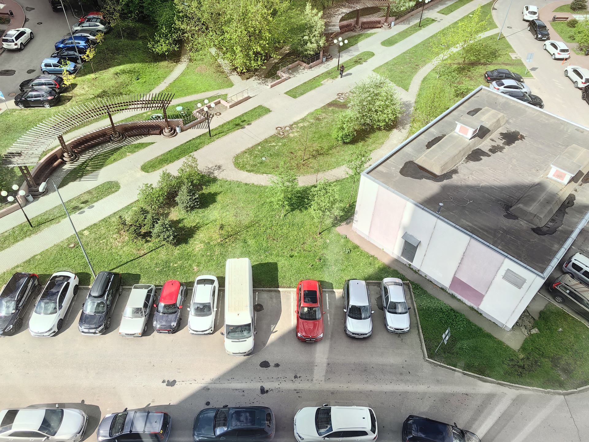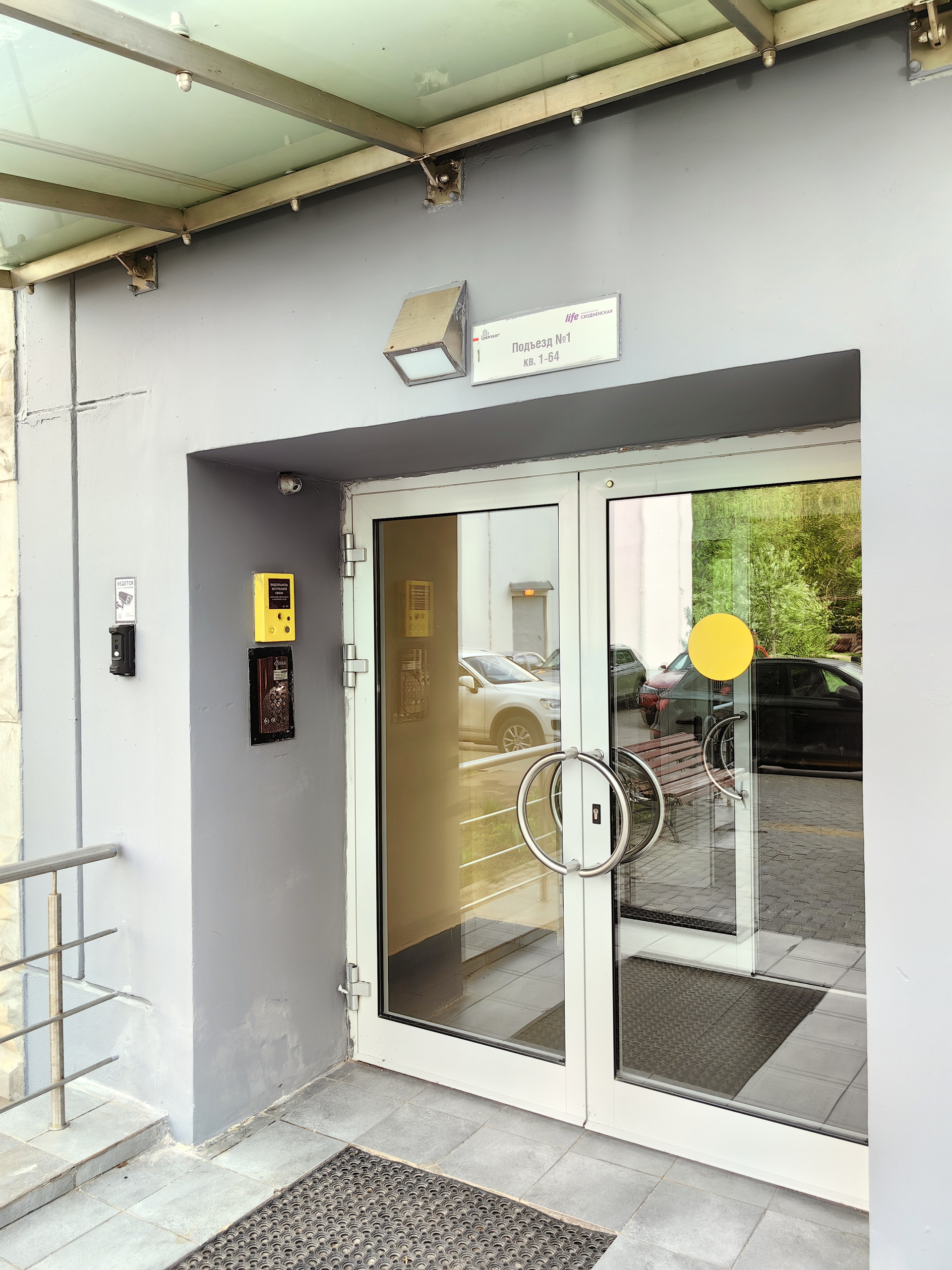 Парковка во дворе, шлагбаум, доступ по брелку.
