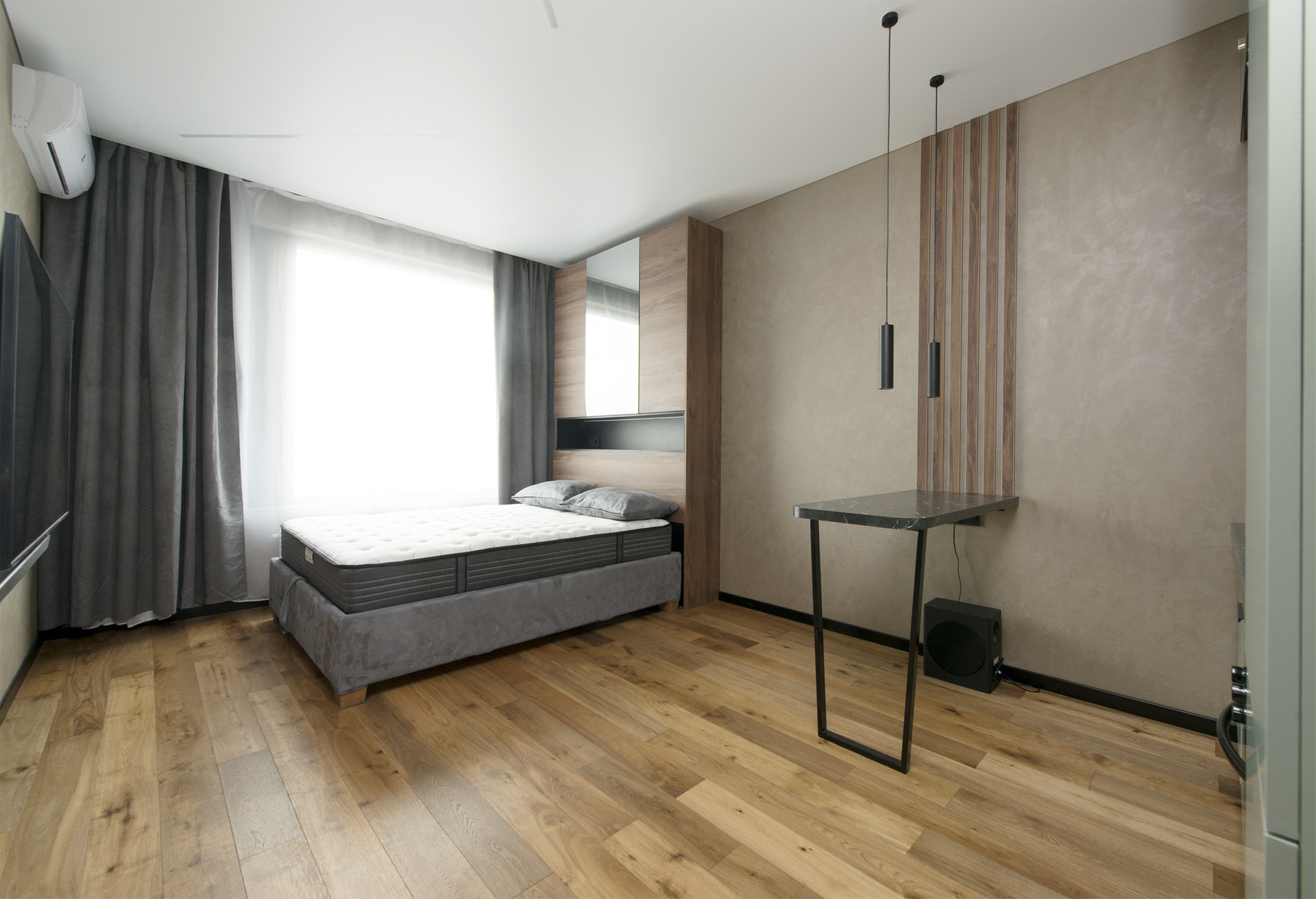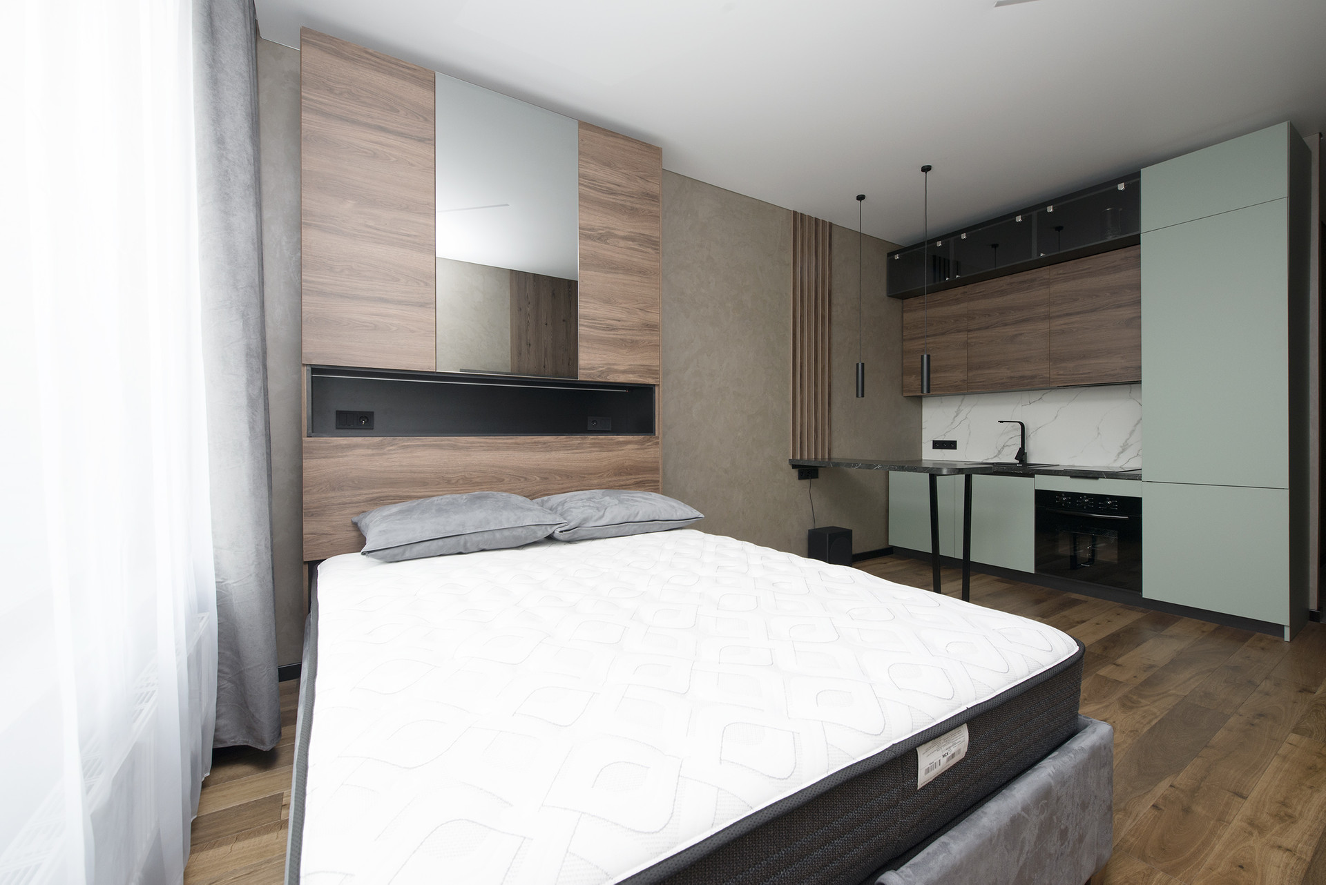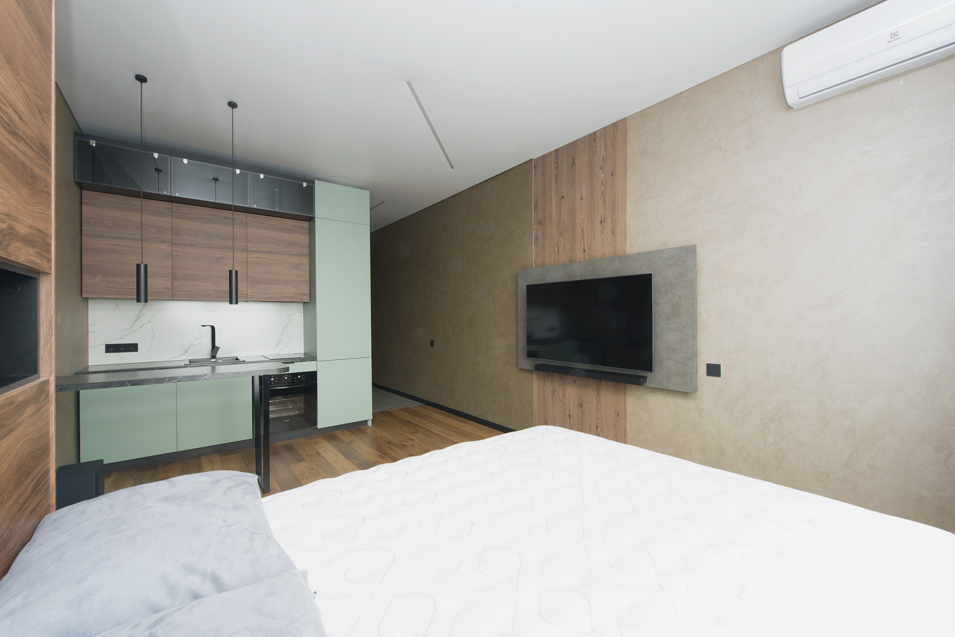 В студии выполнен дизайнерский ремонт с применением качественных материалов отделки.
