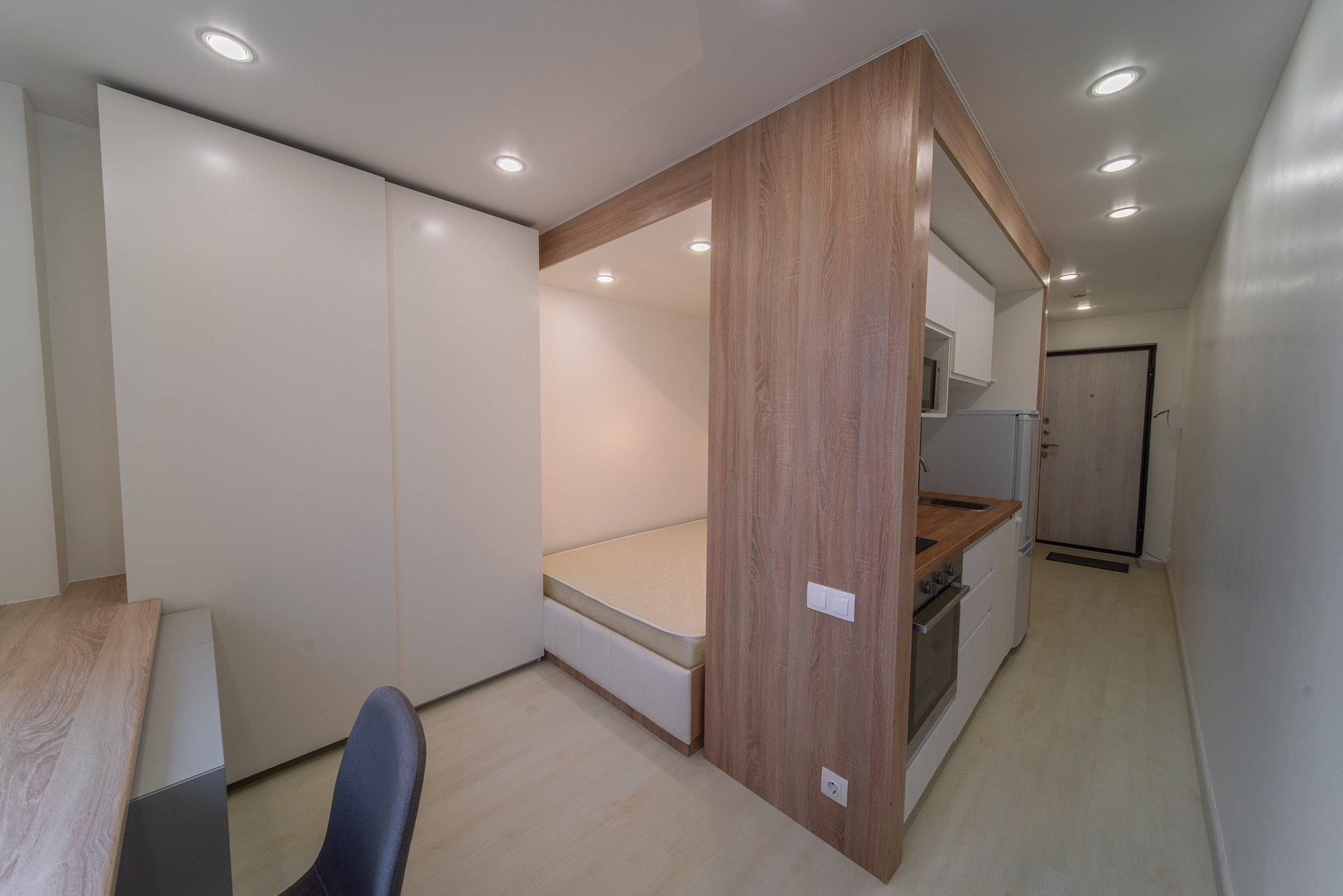 Эргономичная  планировка студии, в которой выделены отдельные зоны сна, работы и готовки еды .