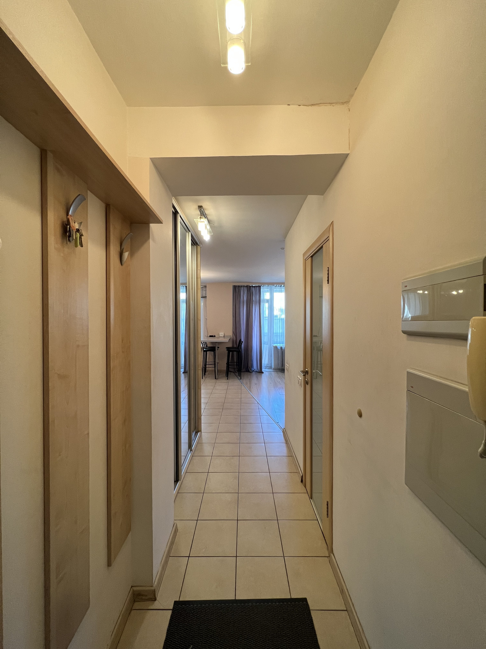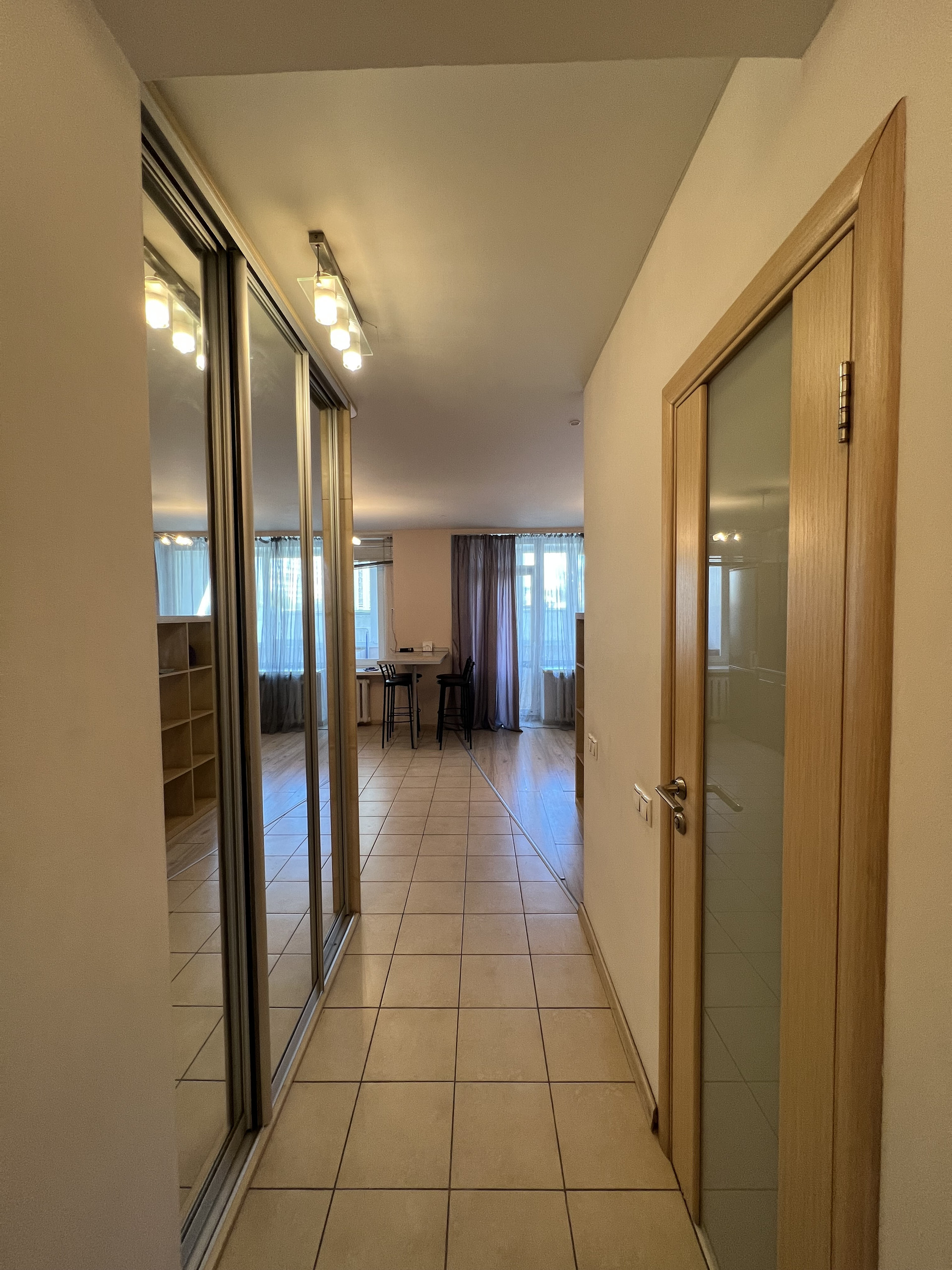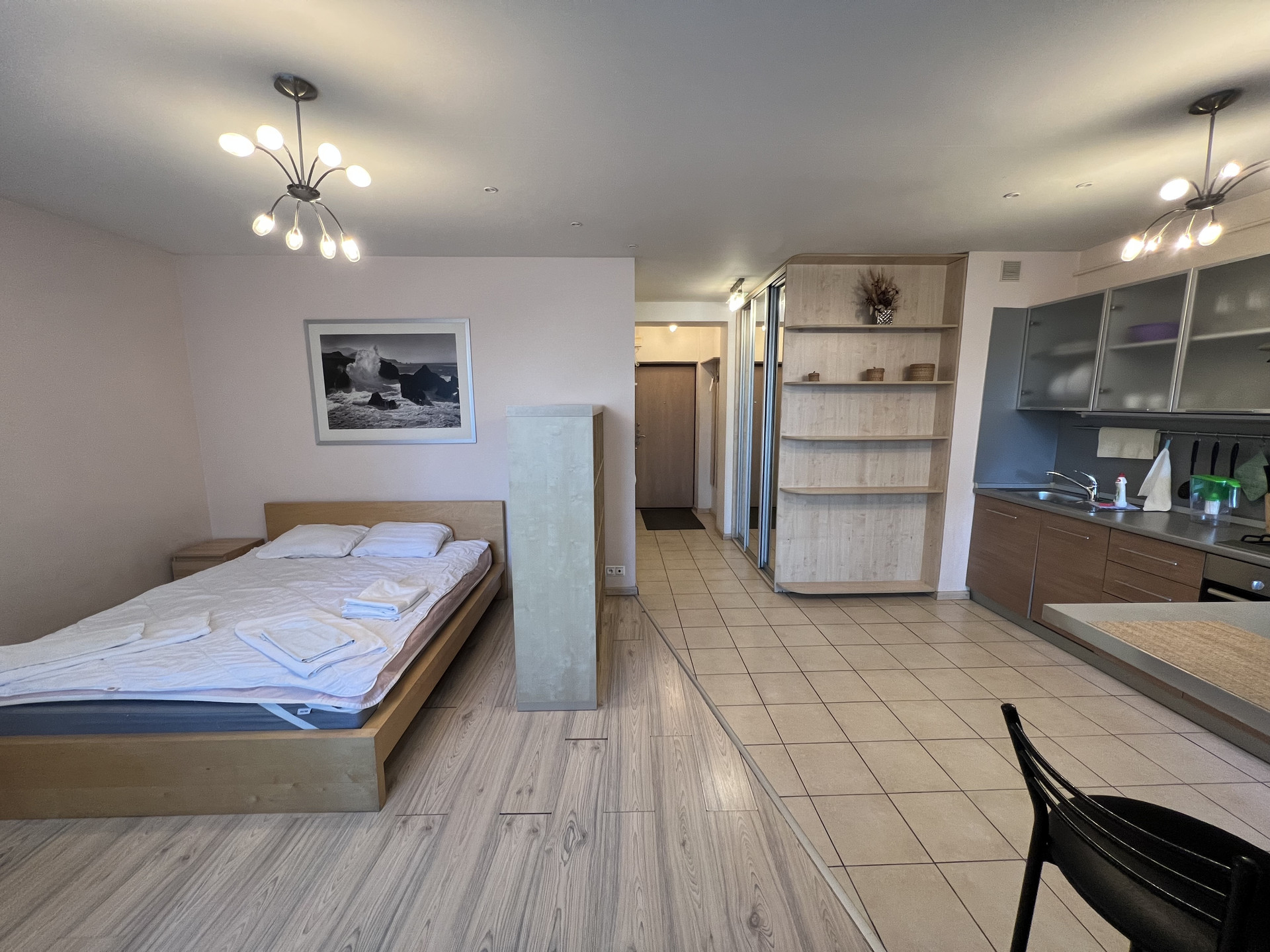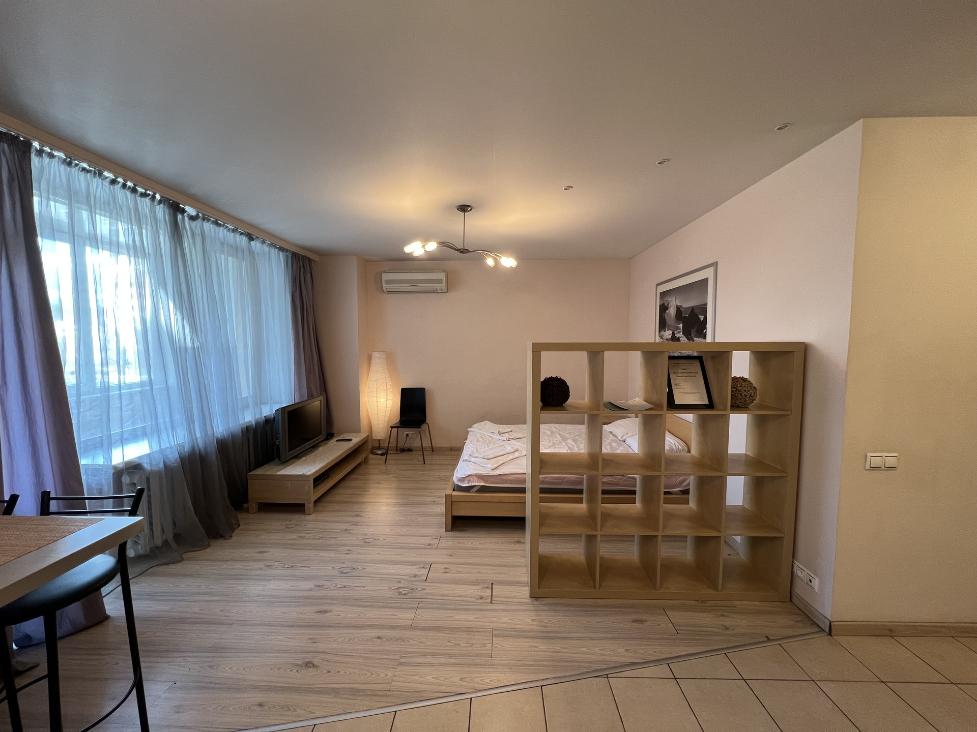 Большая студия, правильной формы со встроенной бытовой техникой, полностью меблирована. Большая застекленная лоджия, кондиционер, гардеробная комната.