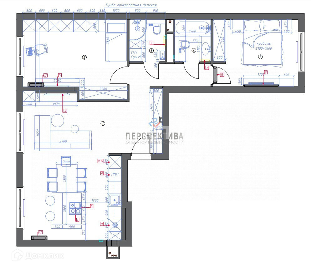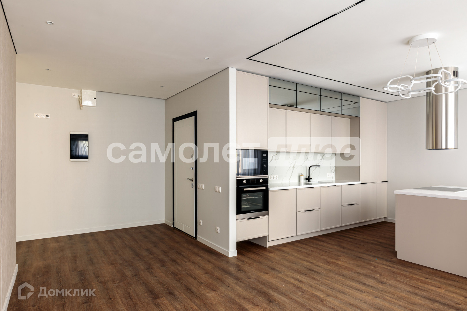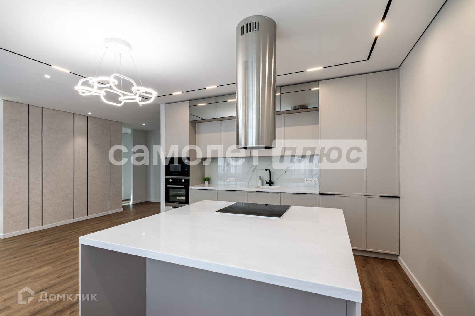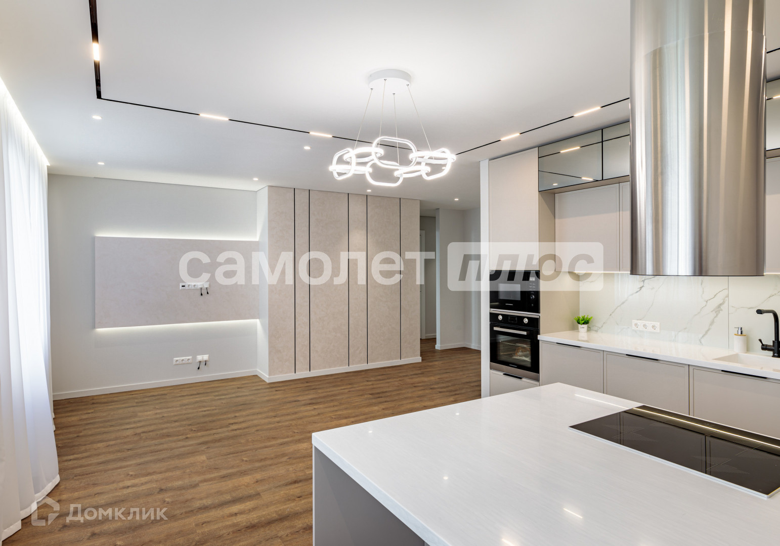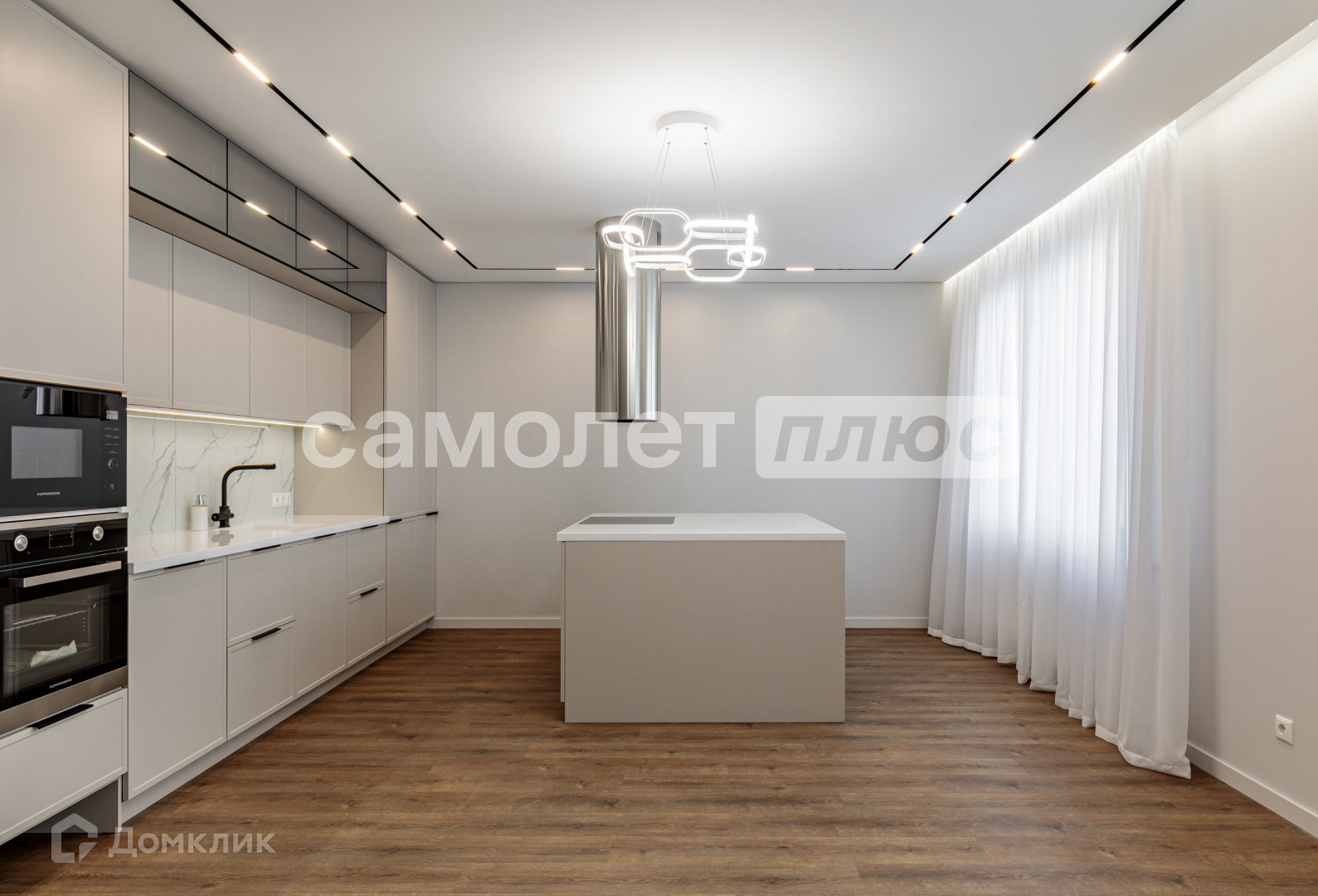 Удачная дизайнерская планировка. В проекте продумано много мест полноценного хранения.  Реализована эргономичная кухня (варочная панель, духовой шкаф, посудомоечная машина, СВЧ-печь марки Kuppersberg, встроенный холодильник).