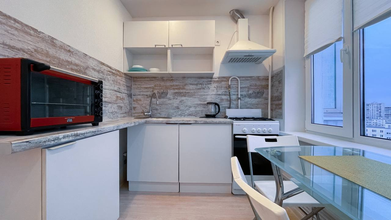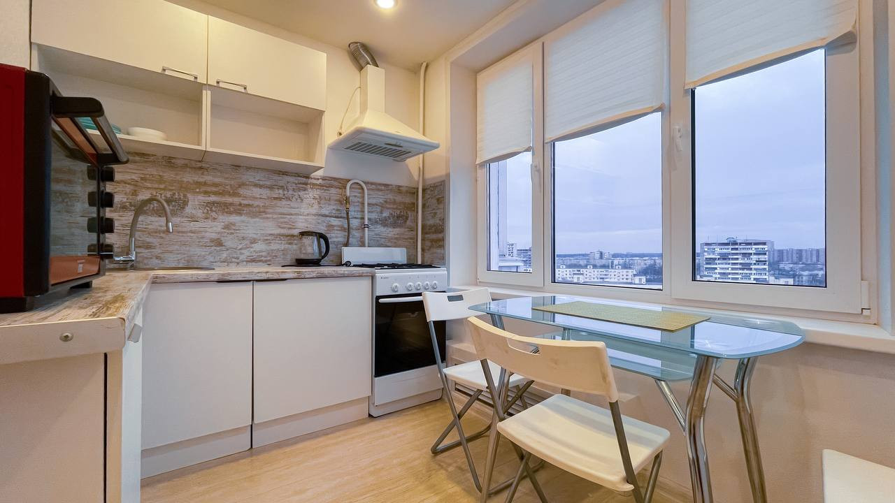 Итак: обратите внимание какой просторной ощущается кухня. Это потому что холодильник просто ювелирно вписался в прихожую и в кухню смогли установить угловой гарнитур с достаточной рабочей поверхностью. Стол у окна, где вечером за ужином может собраться вся семья и обсудить победы уходящего дня. Окно большое и ощущается почти как панорамное. Вид из окна уходит в горизонт. Ничего не препятствует глазу.